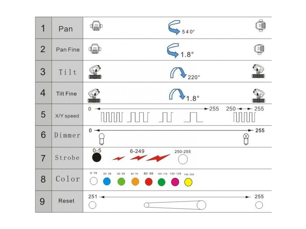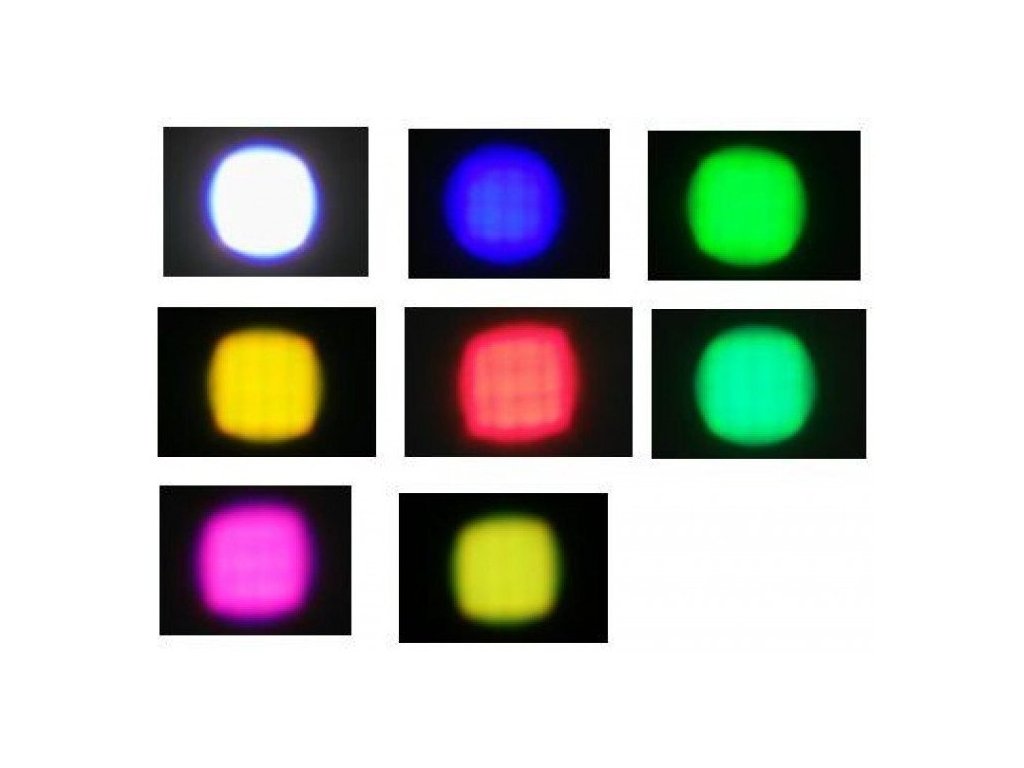 Urządzenie jest wyposażone w koło z 7 nasyconymi kolorami i białym kolorem. RElatywnie niskie zużycie energii (średnio ok. 100W), co jest szczególnie ważne dla mobilnych DJ-ów i zespołów.