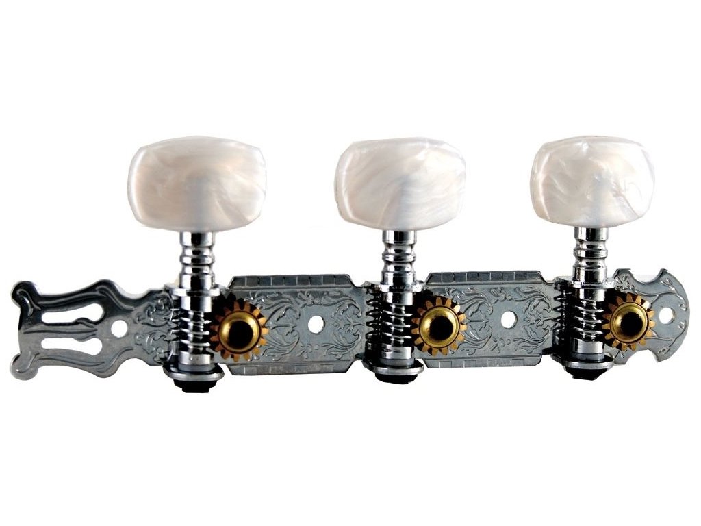 Zestaw chromowanych mechanizmów stroikowych do gitary klasycznej. Rozstaw kołków wynosi 35 mm.