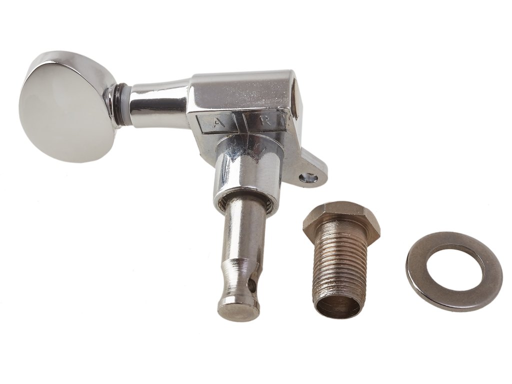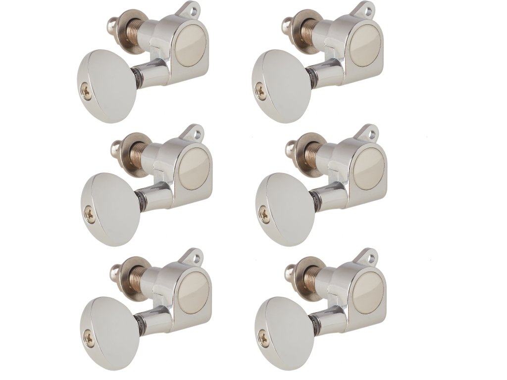 Zestaw chromowanych kluczy do gitary elektrycznej. Opakowanie zawiera sześć sztuk (sześć w rzędzie).