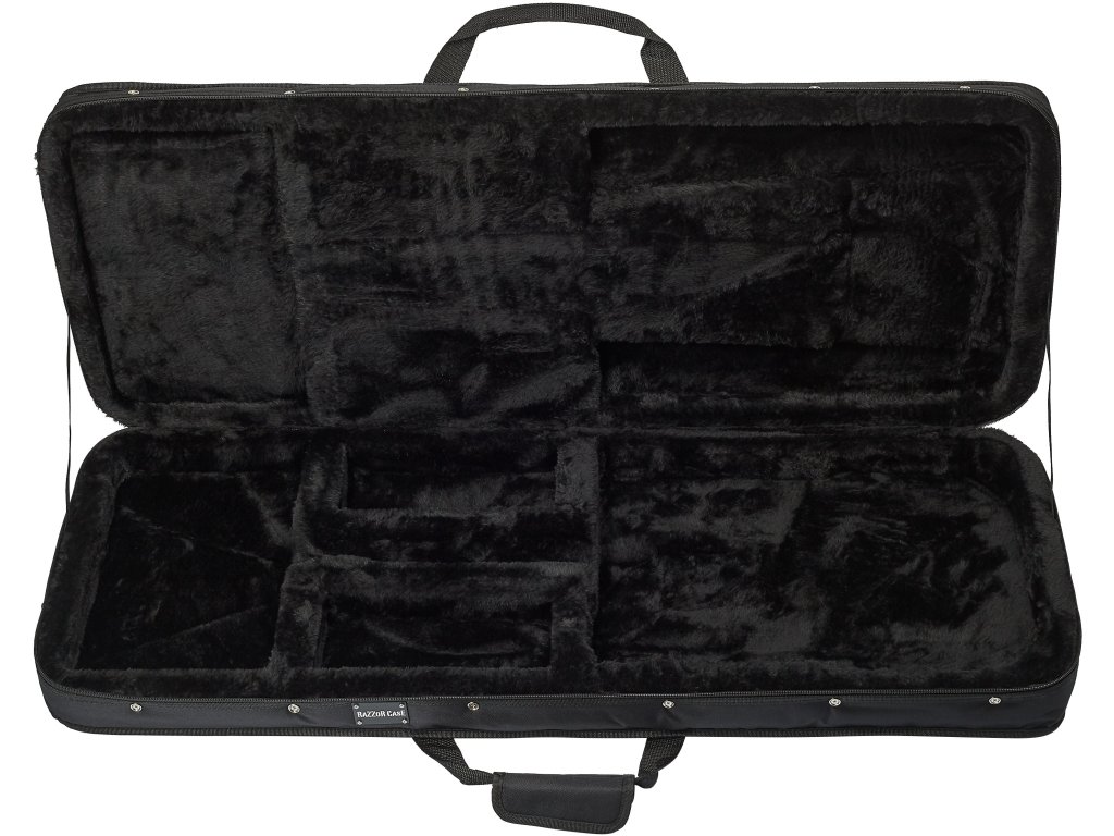 Bardzo mocny, ale lekki futerał na instrumenty od RaZZoR Case. W porównaniu do kufrów ABS lub drewnianych, ma niższą wagę i większą sztywność. Kufer jest wykonany z materiału, który jest odporny na rozerwanie i przebicie. Jeśli szukasz 100% ochrony dla swojego instrumentu za rozsądne pieniądze, produkty RaZZoR Case są oczywistym wyborem. Duża zewnętrzna kieszeń na akcesoria, wewnętrzna kieszeń na akcesoria, wnętrze EPS odpowiednie do gitar elektrycznych.