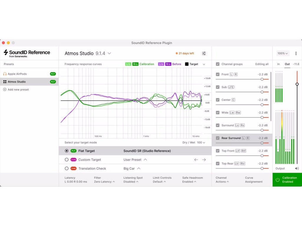 SoundID Reference for Multichannel, czyli kalibracja Sonarworks zaprojektowana dla aplikacji wielokanałowych, zapewnia niezawodny dźwięk referencyjny w zakresie od prostych zestawów stereo po systemy atmos 9.1.6. Oprogramowanie można również używać z ponad 480 różnymi modelami słuchawek, które są dodawane do rosnącej biblioteki profili kalibracyjnych Sonarworks. Dzięki temu uzyskasz ten sam referencyjny dźwięk zarówno na monitorach studyjnych, jak i na słuchawkach.