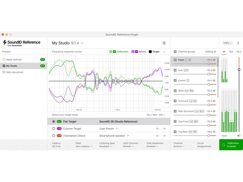 SoundID Reference for Multichannel, czyli kalibracja Sonarworks zaprojektowana dla aplikacji wielokanałowych, zapewnia niezawodny dźwięk referencyjny w zakresie od prostych zestawów stereo po systemy atmos 9.1.6. Oprogramowanie można również używać z ponad 480 różnymi modelami słuchawek, które są dodawane do rosnącej biblioteki profili kalibracyjnych Sonarworks. Dzięki temu uzyskasz ten sam referencyjny dźwięk zarówno na monitorach studyjnych, jak i na słuchawkach.