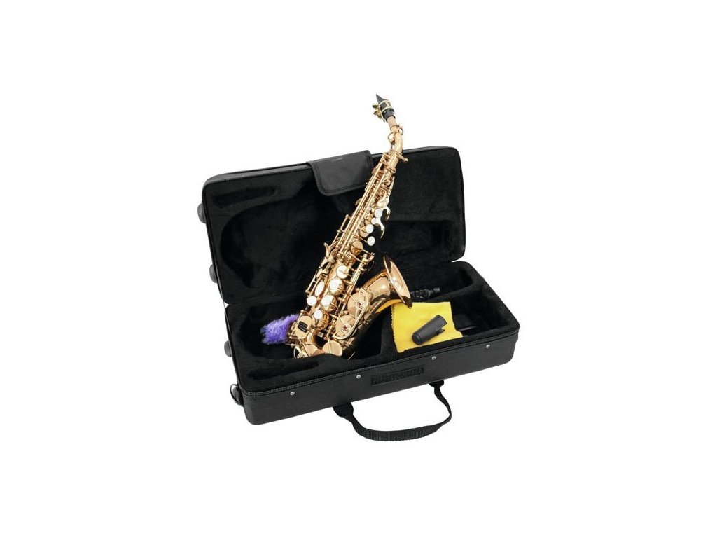 Saksofon sopranowy B, podnośnik F, podpórka pod kciuk, lakierowany na złoto, z futerałem ABS i akcesoriami.