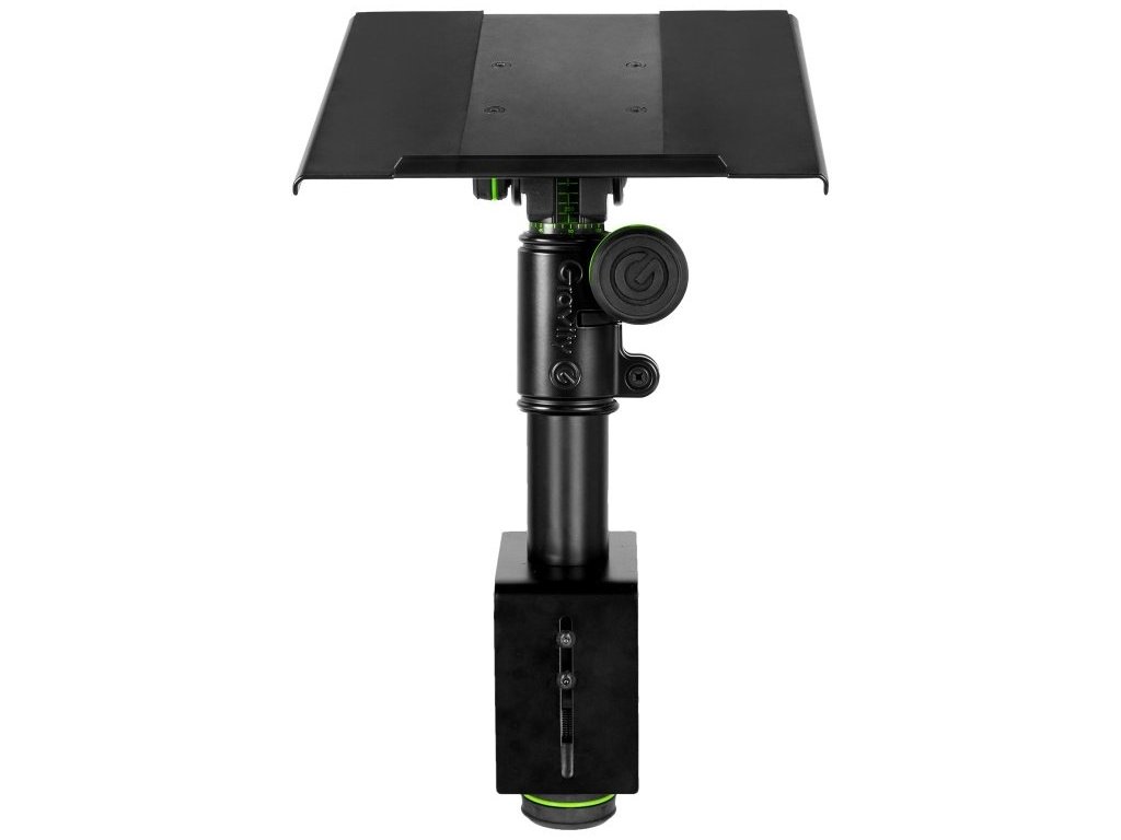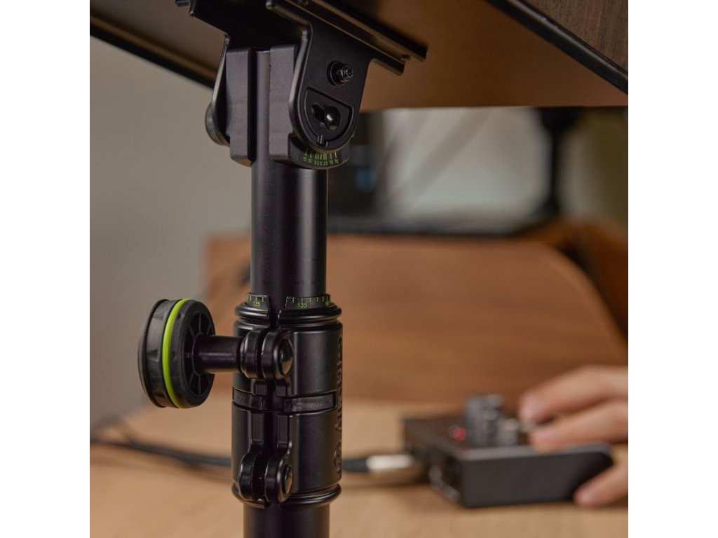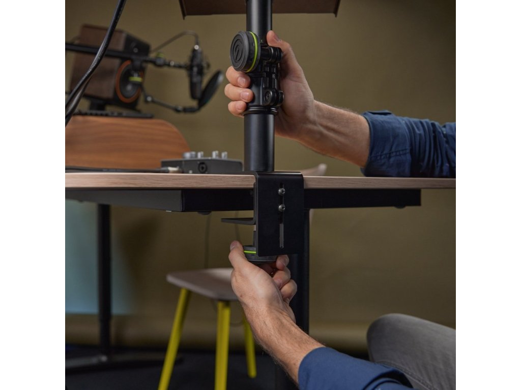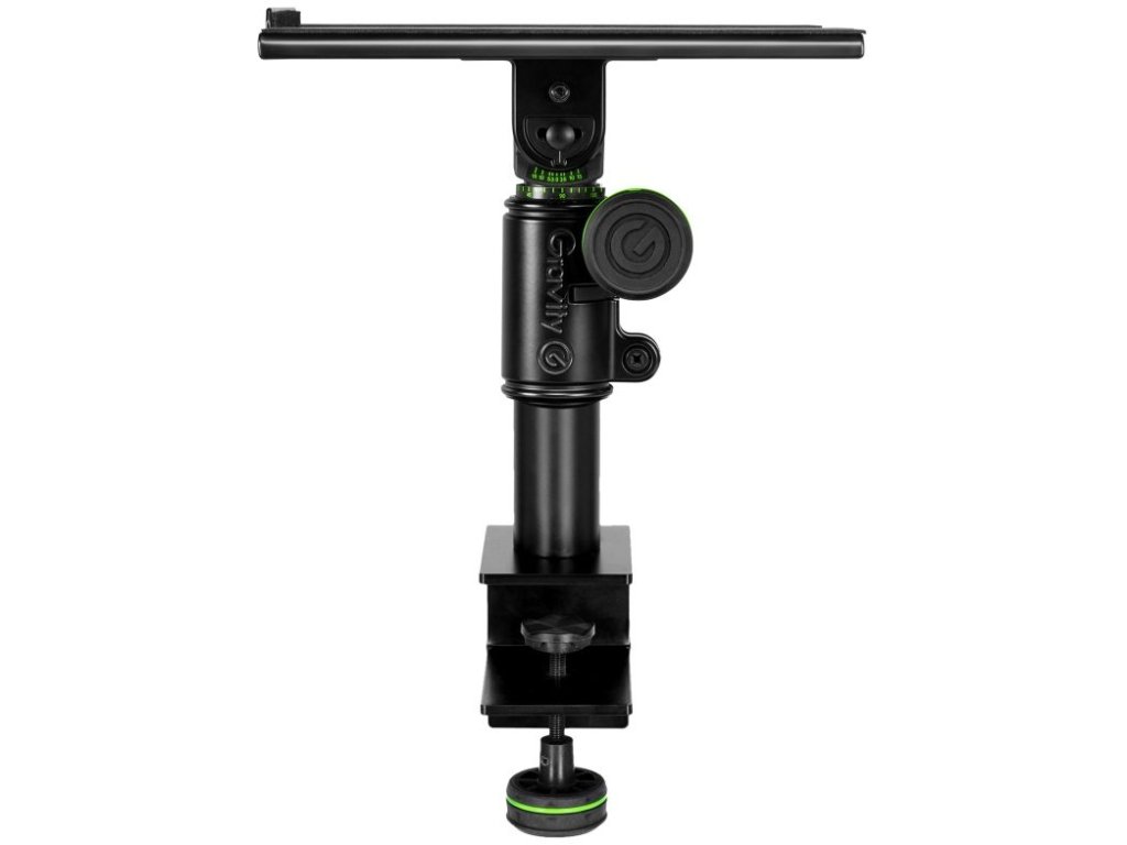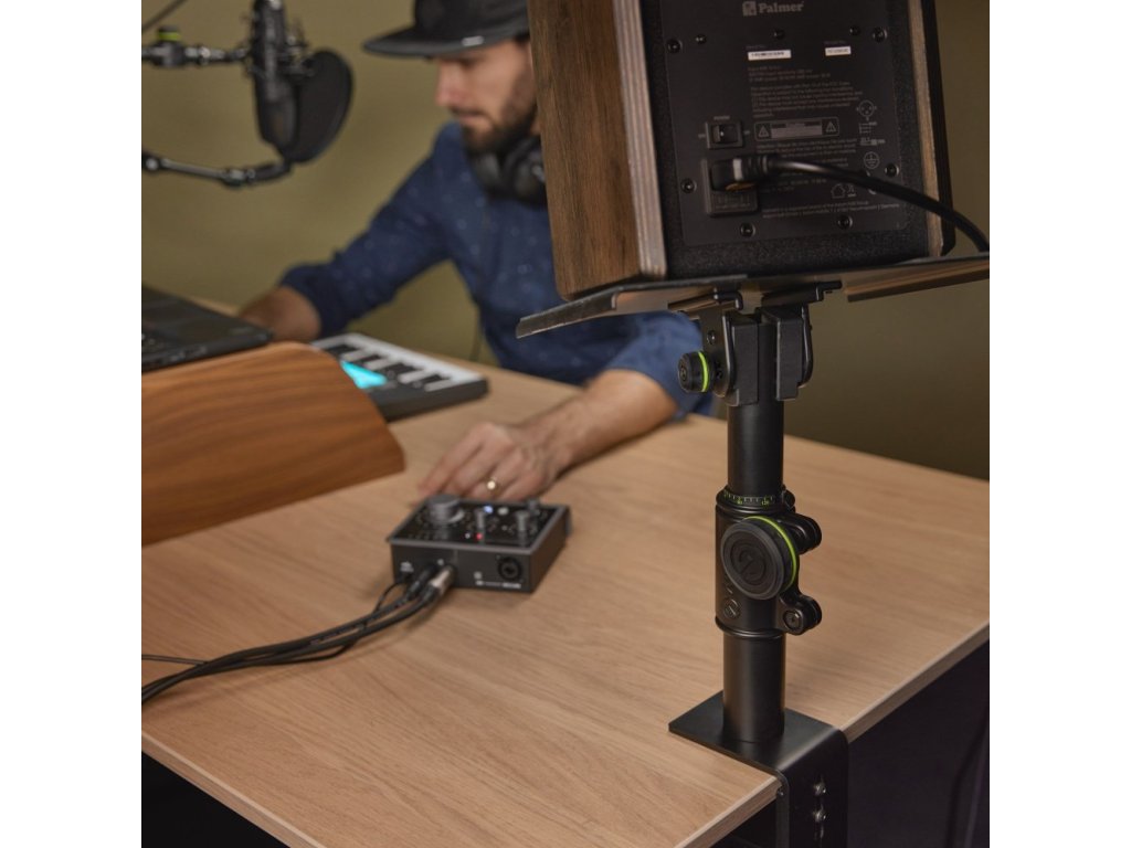 Firma Gravity rozwiązała wszystkie te problemy za pomocą modelu SP 3102 TM. Statyw do monitorów studyjnych jest wyposażony w zacisk stołowy do bezpiecznego i niezawodnego przymocowania konstrukcji do stołów z blatem o grubości nie większej niż 100 mm. Podobnie jak inne produkty Gravity, można go dokręcić za pomocą solidnego i praktycznego pokrętła. W przeciwieństwie do zwykłych stojaków stołowych, które wymagają dużej podstawy, aby się nie poruszyły, podstawa zacisku SP 3102 TM ma wymiary zaledwie 10 × 7 cm i nie zajmuje więcej miejsca niż standardowy uchwyt ekranu. Konstrukcja stojaków na monitory studyjne zapewnia, że nie wystają one zbytnio z biurka. Zapewnia to większą odległość między słuchaczem a monitorami, nawet jeśli biurka nie są zbyt głębokie, a także doskonałe umiejscowienie głośników, aby znaleźć "sweet spot" w pomieszczeniu.