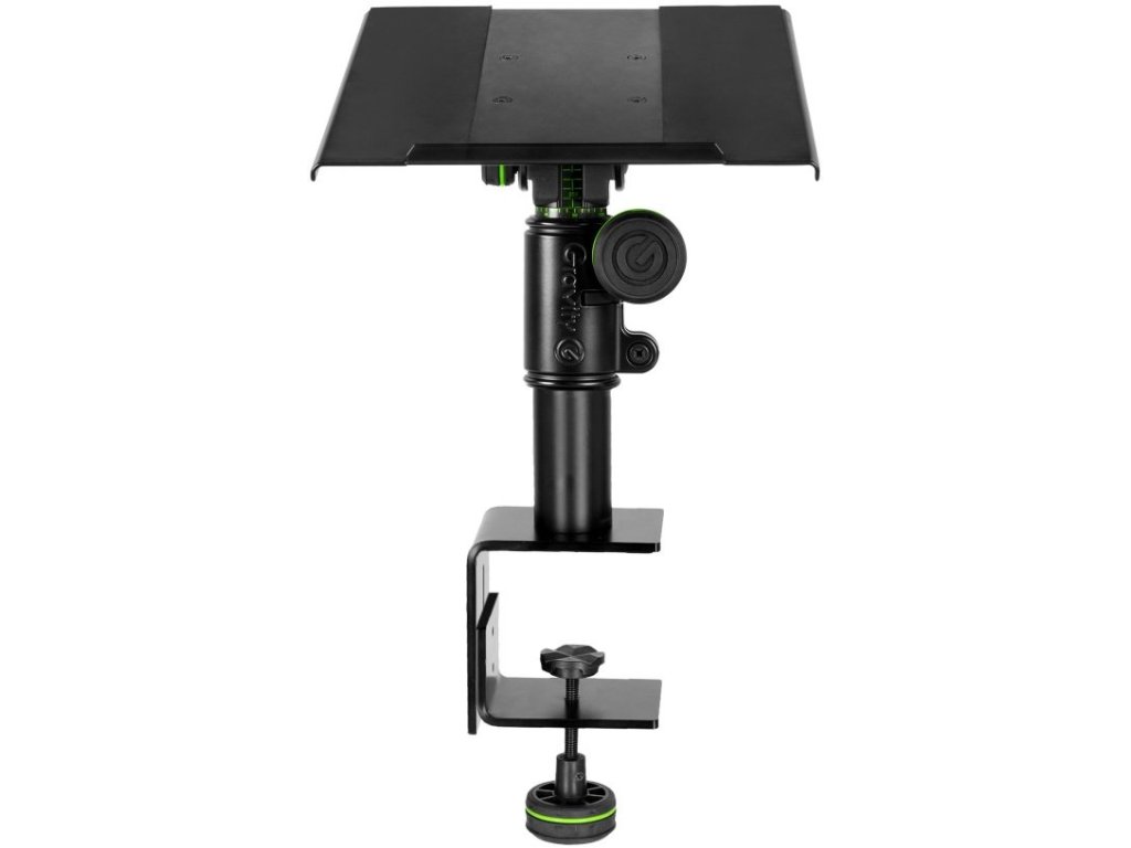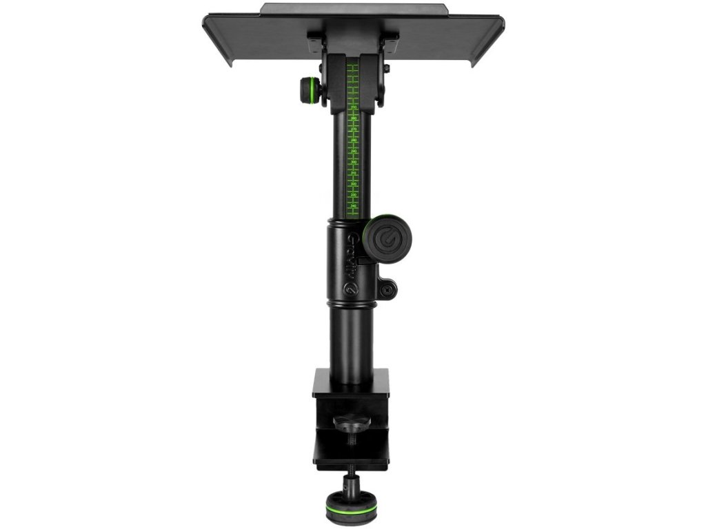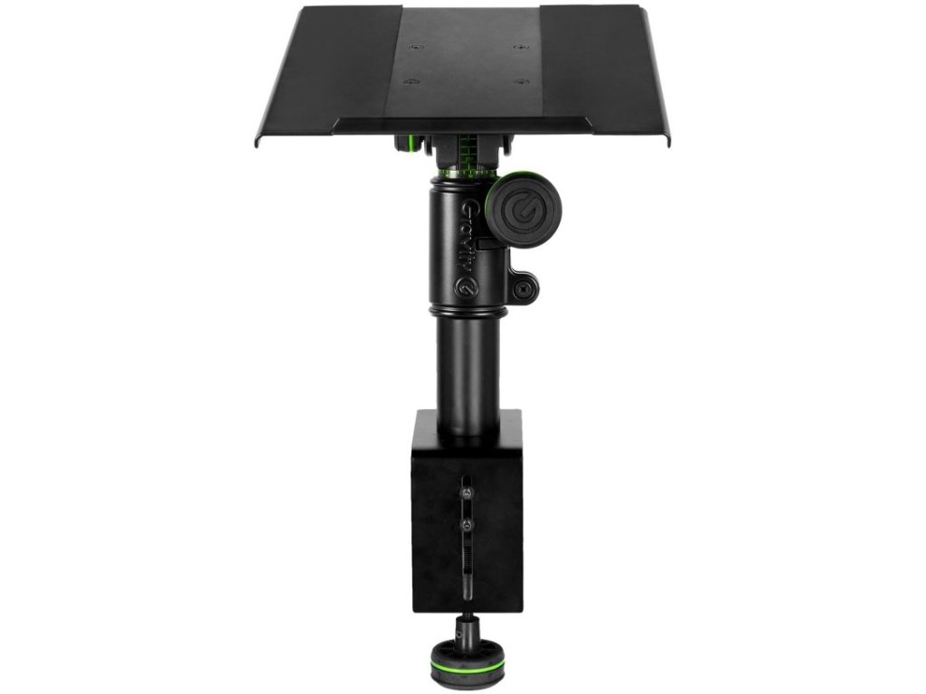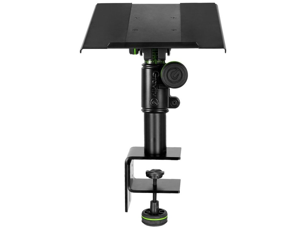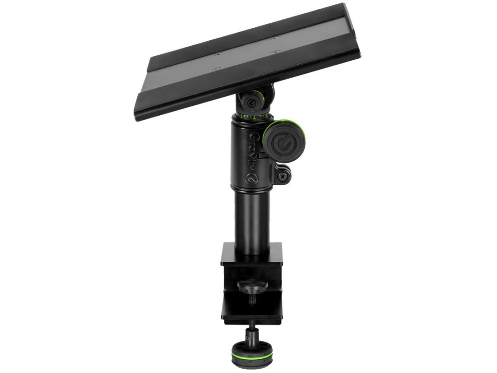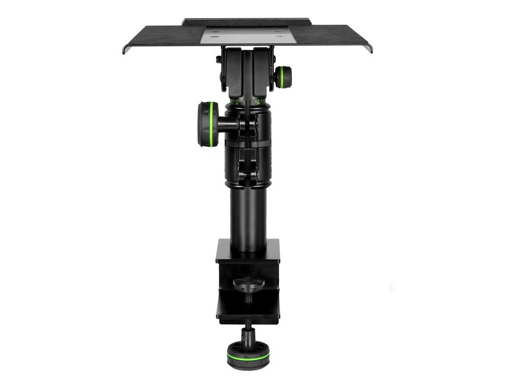 Firma Gravity rozwiązała wszystkie te problemy za pomocą modelu SP 3102 TM. Statyw do monitorów studyjnych jest wyposażony w zacisk stołowy do bezpiecznego i niezawodnego przymocowania konstrukcji do stołów z blatem o grubości nie większej niż 100 mm. Podobnie jak inne produkty Gravity, można go dokręcić za pomocą solidnego i praktycznego pokrętła. W przeciwieństwie do zwykłych stojaków stołowych, które wymagają dużej podstawy, aby się nie poruszyły, podstawa zacisku SP 3102 TM ma wymiary zaledwie 10 × 7 cm i nie zajmuje więcej miejsca niż standardowy uchwyt ekranu. Konstrukcja stojaków na monitory studyjne zapewnia, że nie wystają one zbytnio z biurka. Zapewnia to większą odległość między słuchaczem a monitorami, nawet jeśli biurka nie są zbyt głębokie, a także doskonałe umiejscowienie głośników, aby znaleźć "sweet spot" w pomieszczeniu.
