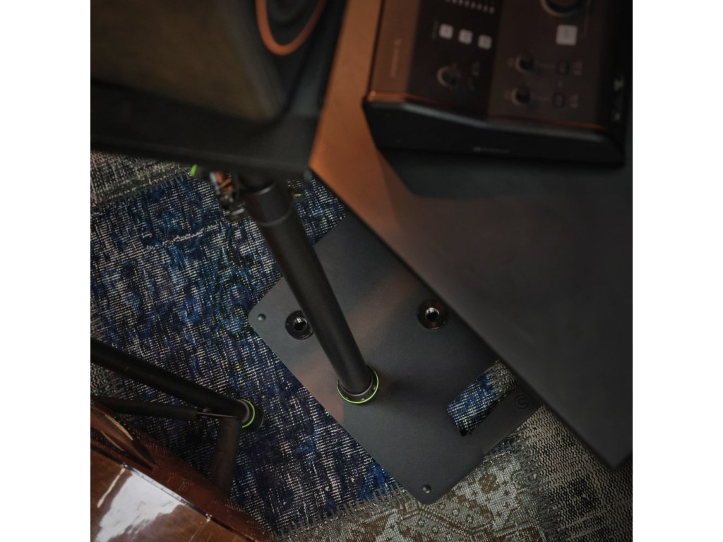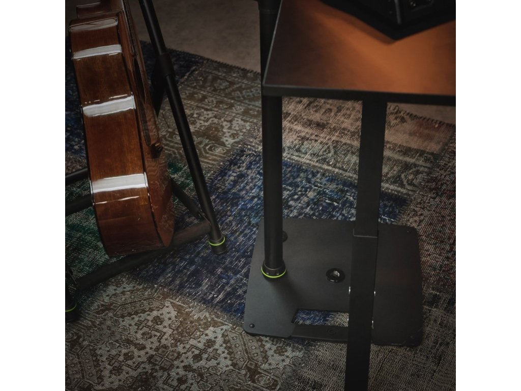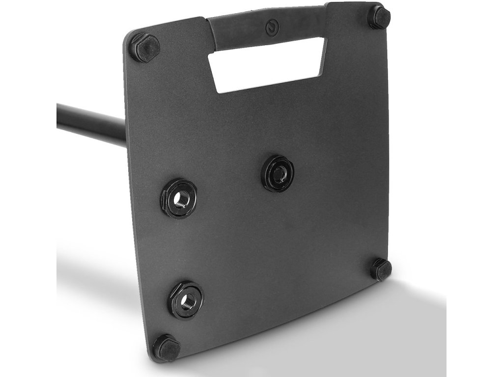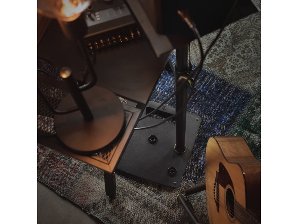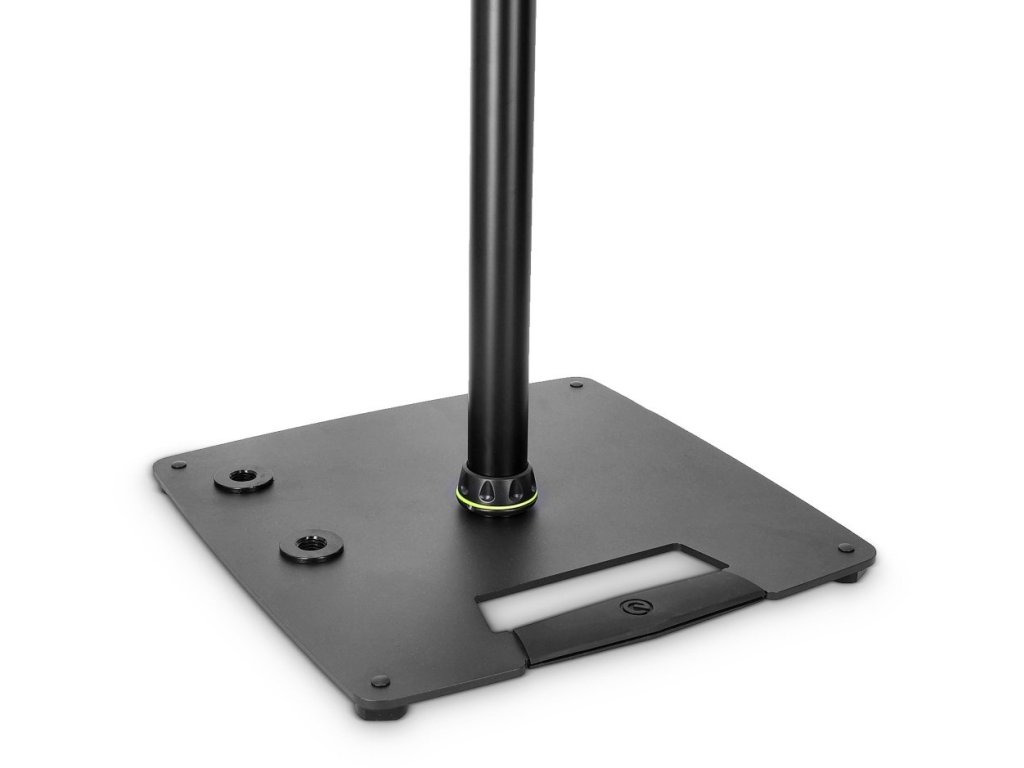 Stojak do monitorów studyjnych Gravity SP 3202 CS B jest wyposażony w kwadratową stalową płytę podstawy, która dzięki swojej masie 7 kg zapewnia, że stojak stoi zawsze bezpiecznie i doskonale stabilnie. Płyta podstawy ma również gumowany uchwyt ułatwiający transport i jest wyposażona w sumie w trzy gwinty M20: jeden na środku płyty i dwa na krawędzi. Zapewnia to większą elastyczność podczas ustawiania.