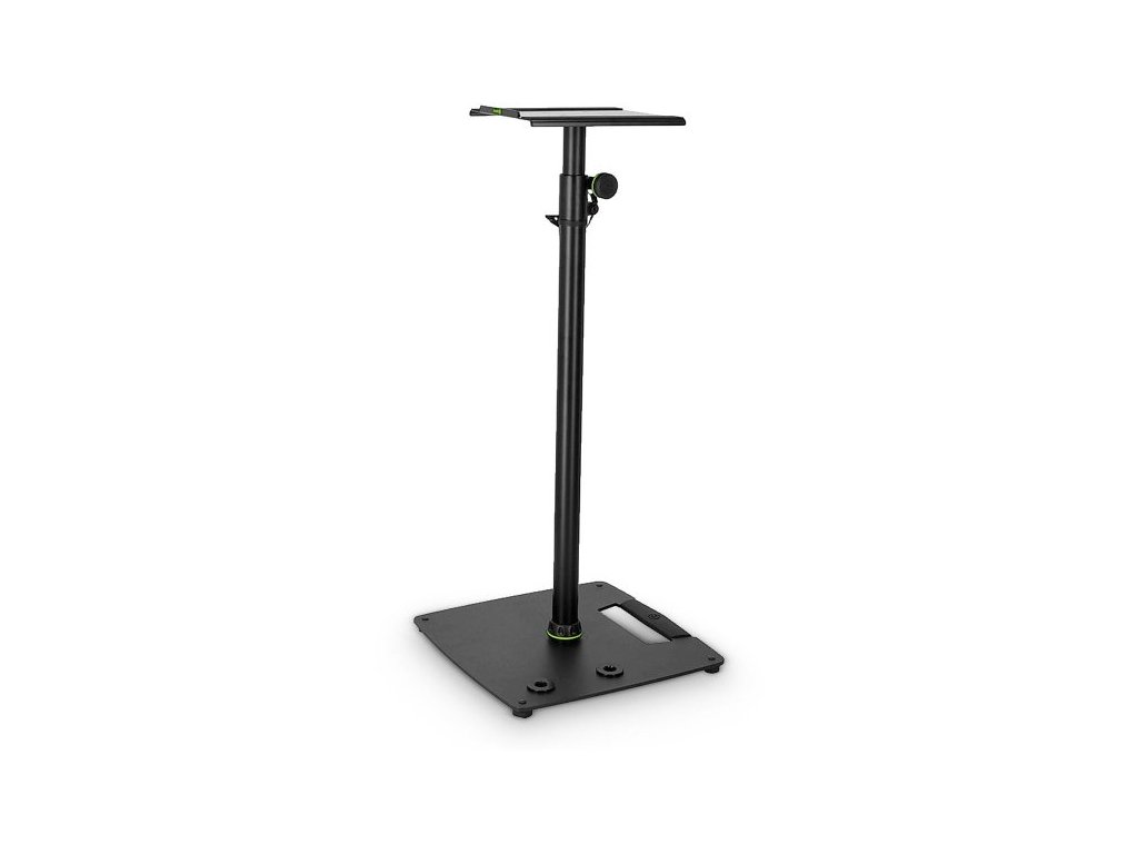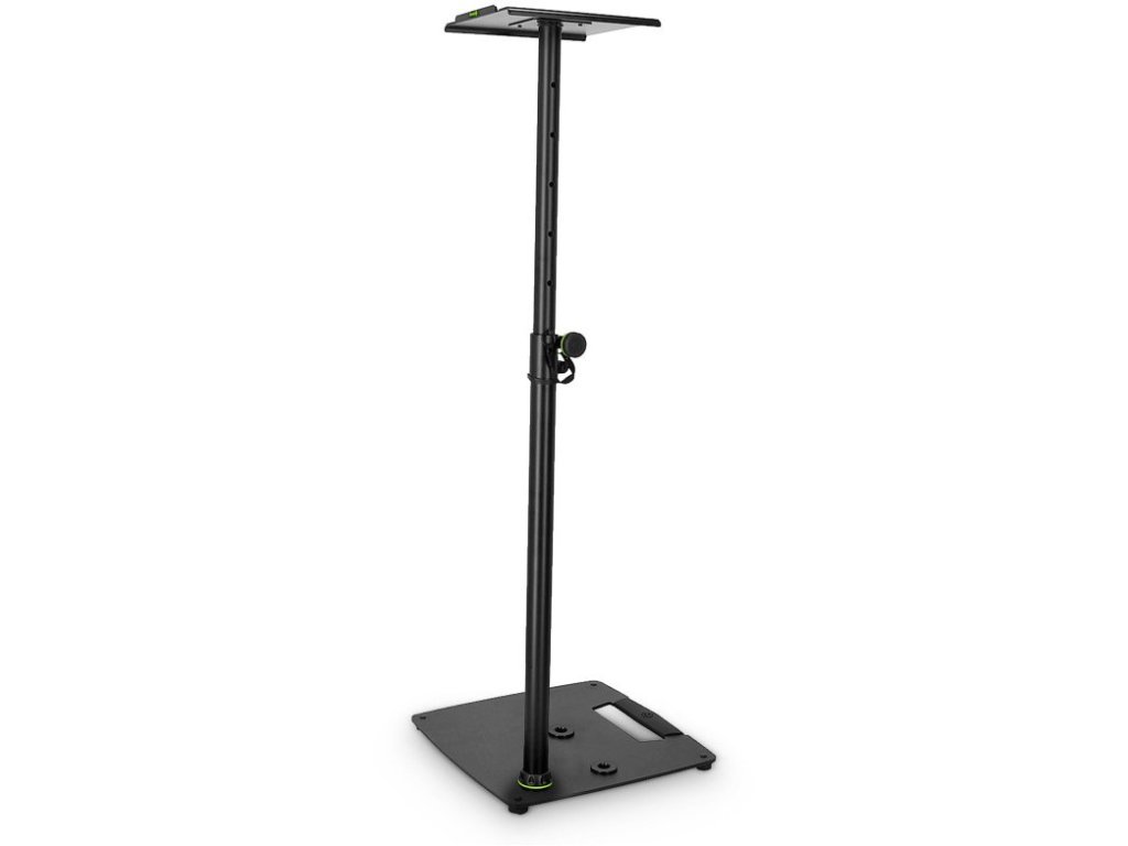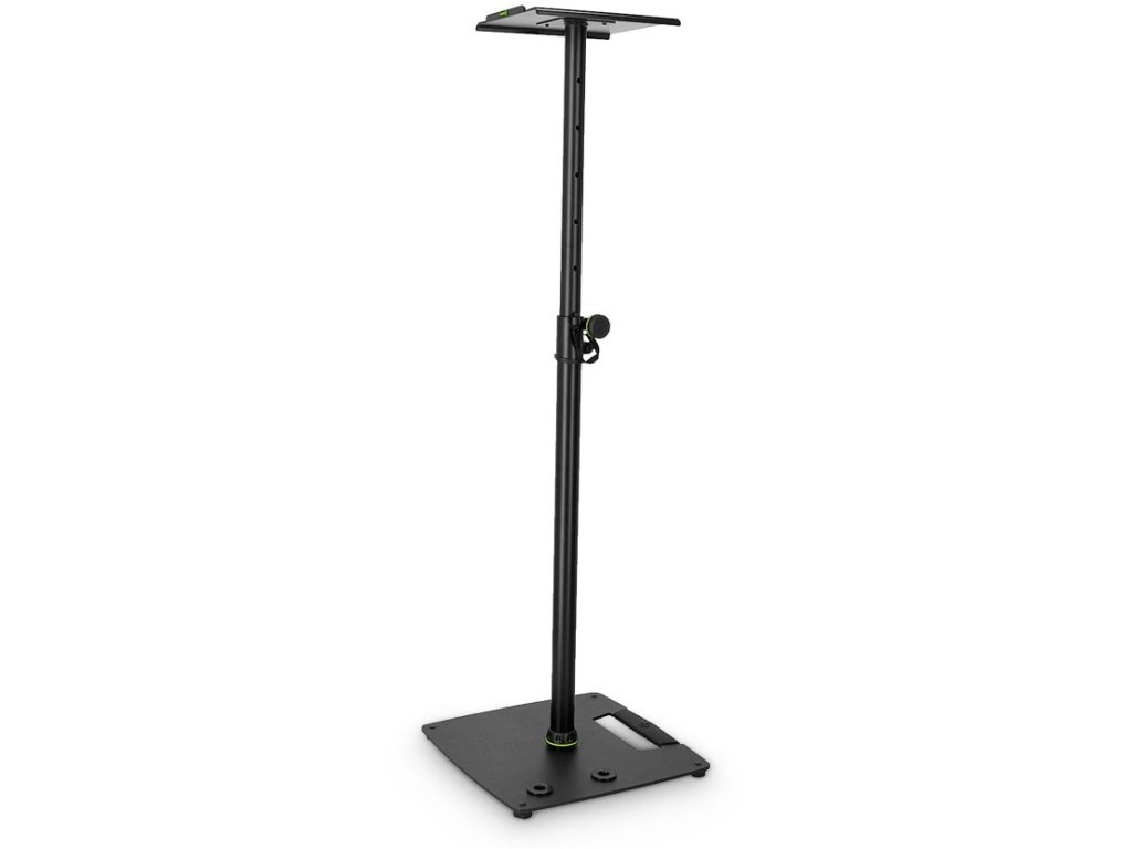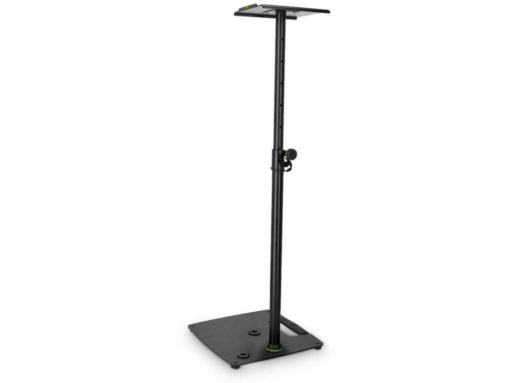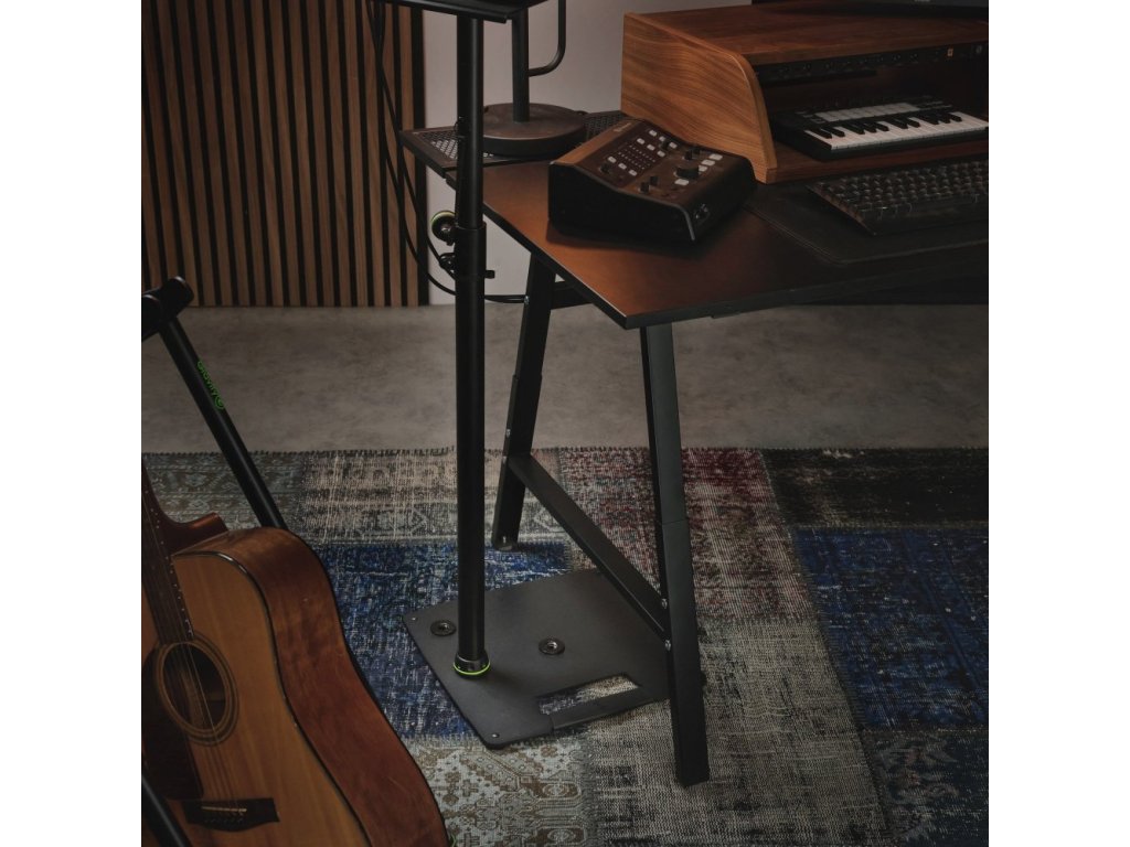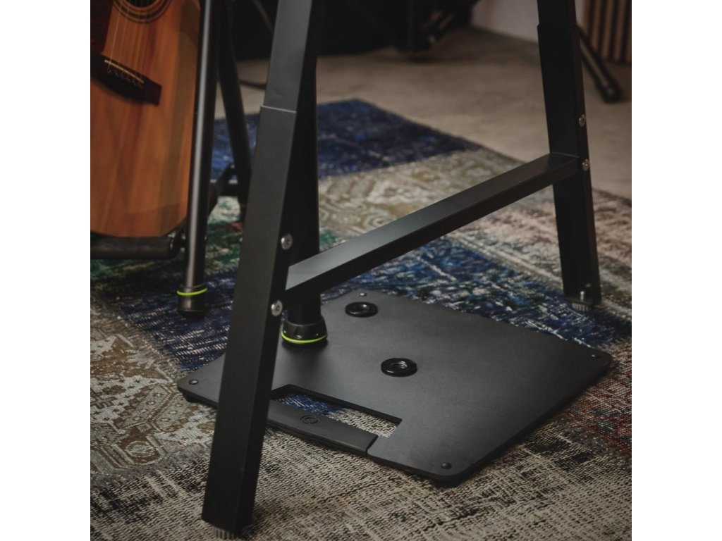 Stojak do monitorów studyjnych Gravity SP 3202 CS B jest wyposażony w kwadratową stalową płytę podstawy, która dzięki swojej masie 7 kg zapewnia, że stojak stoi zawsze bezpiecznie i doskonale stabilnie. Płyta podstawy ma również gumowany uchwyt ułatwiający transport i jest wyposażona w sumie w trzy gwinty M20: jeden na środku płyty i dwa na krawędzi. Zapewnia to większą elastyczność podczas ustawiania.