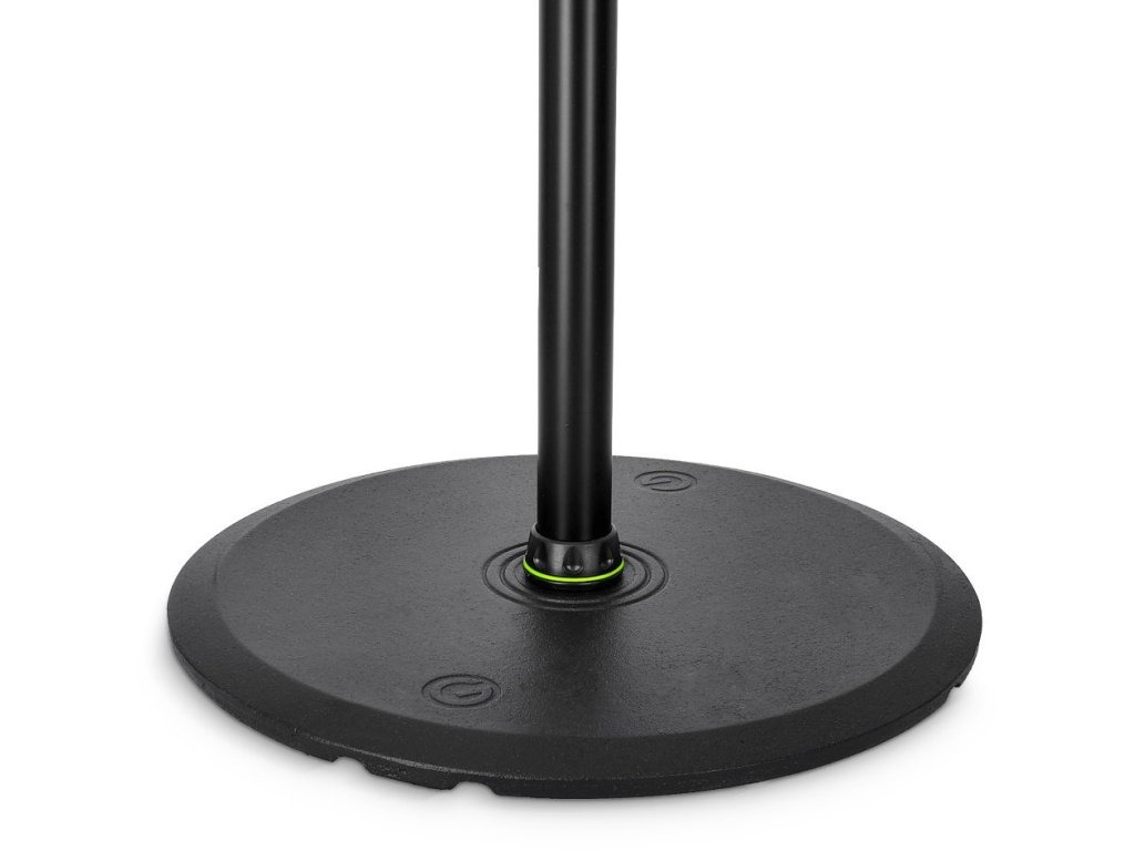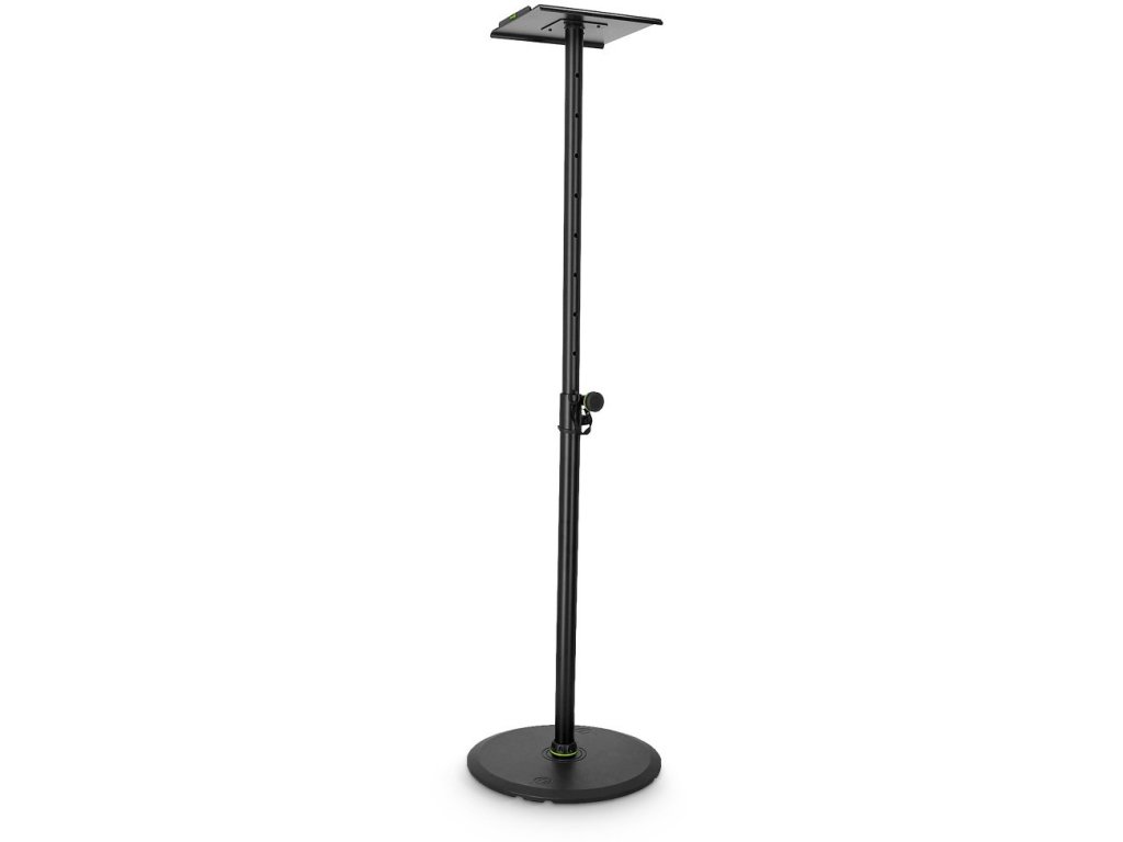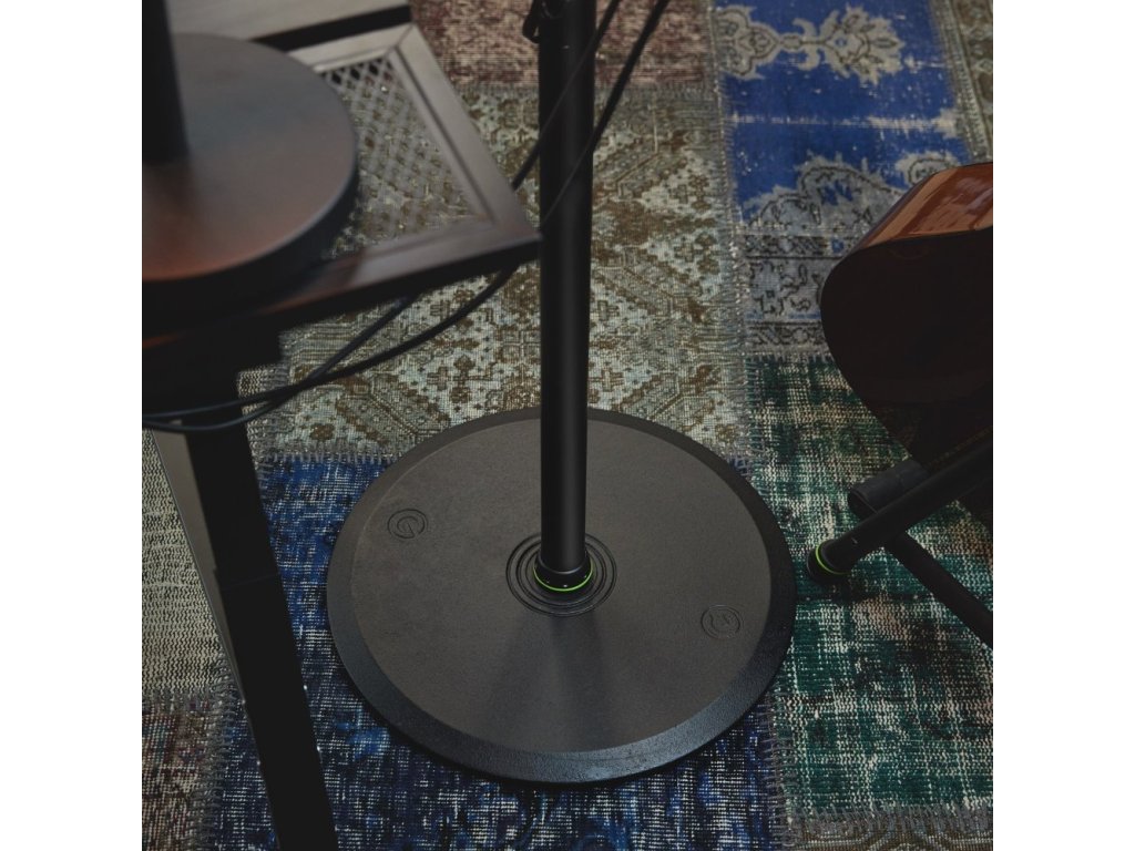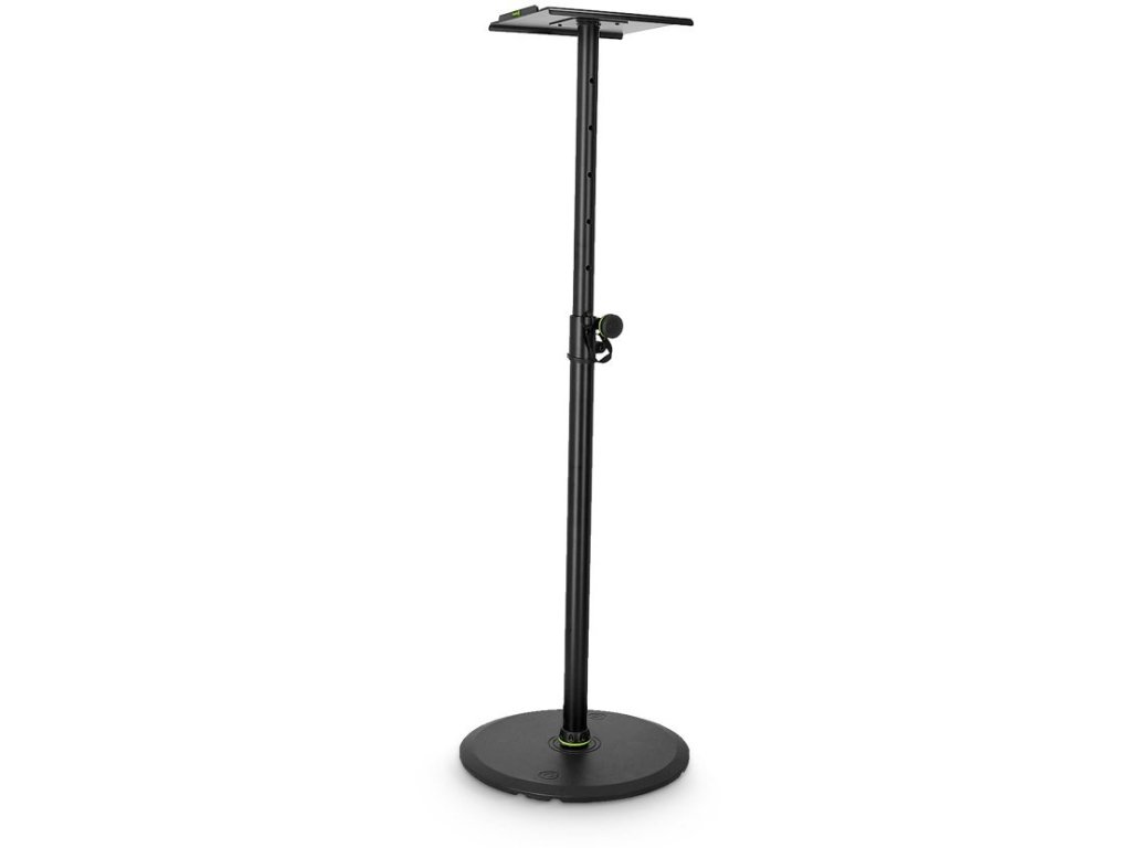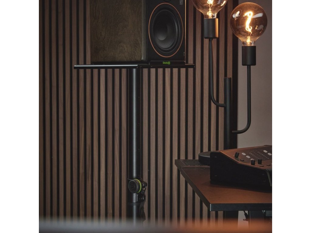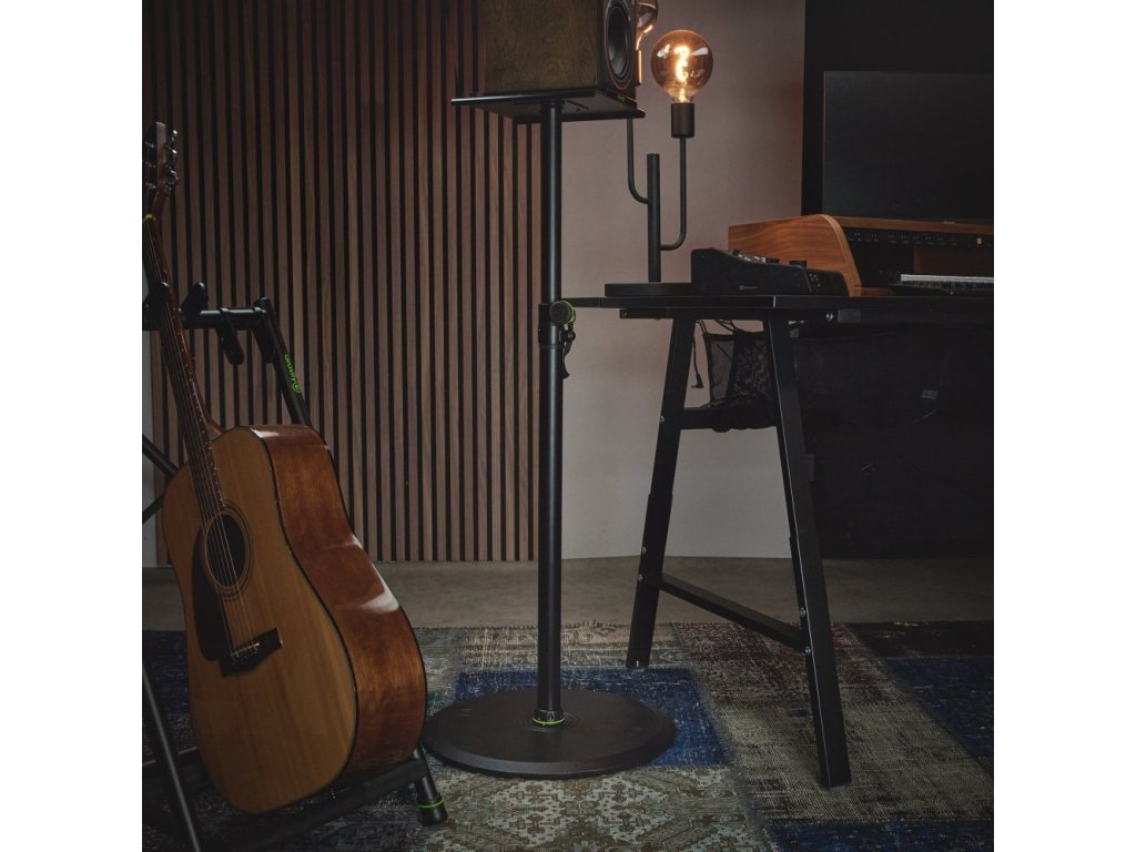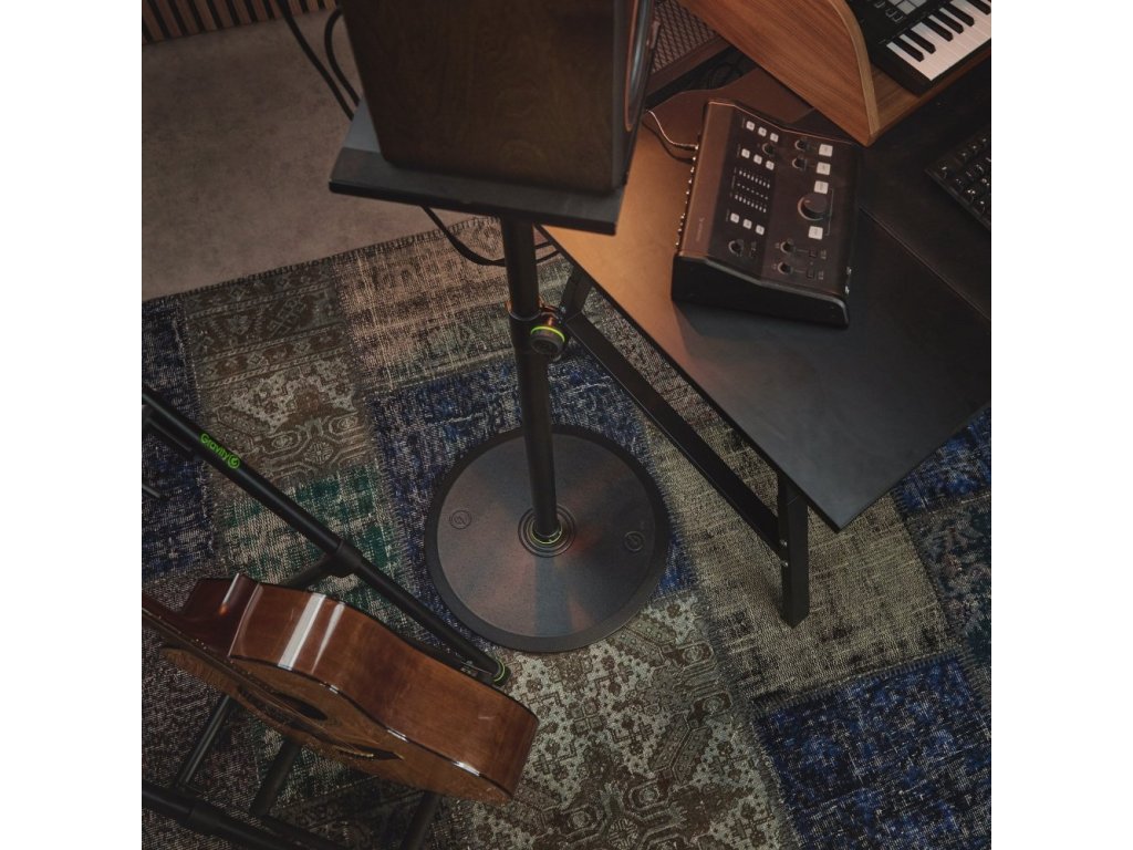 Stojak pod monitory studyjne Gravity SP 3202 LRB ma okrągłą, żeliwną podstawę, która waży 9 kg i zapewnia bezpieczną stabilność stojaka. W razie potrzeby masę podstawy można zwiększyć o dodatkowe 5 kg za pomocą opcjonalnej płyty obciążeniowej WB 123 WPB. Aby zapewnić optymalne umiejscowienie głośników, stojak można łatwo regulować na wysokość w zakresie od 860 mm do 1500 mm i zamocować na miejscu za pomocą śruby regulacyjnej i kołka zabezpieczającego. Podstawa pod głośniki ma wymiary 250 mm x 250 mm i jest wyposażona w materiał EVA, który chroni i izoluje monitory studyjne, zapewniając najlepszą jakość dźwięku.
