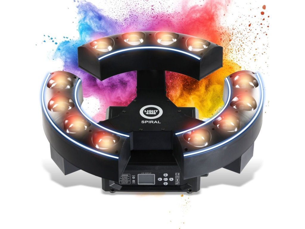Light4Me Spiral to zaawansowany, obrotowy efekt świetlny LED DMX, który natychmiast przyciąga uwagę dynamicznymi animacjami i obrotową konstrukcją. Dzięki nieskończonej rotacji Pan, łącznie 12 diodom LED 20W RGBW 4w1 i dodatkowym 39 diodom SMD RGB stworzysz spektakularne sceny świetlne na parkiecie, scenie lub w klubie. To idealne rozwiązanie dla DJ-ów, agencji eventowych, klubów muzycznych i scen koncertowych, gdzie liczy się intensywna dynamika światła, efektowna projekcja wzorów i pełna kontrola przez DMX.