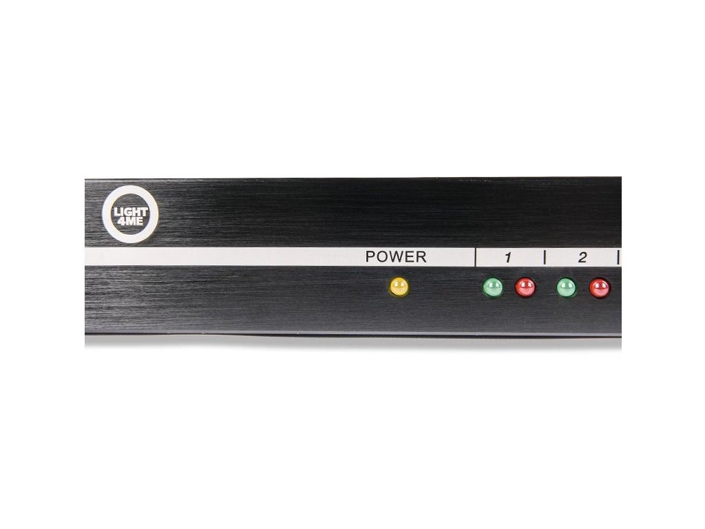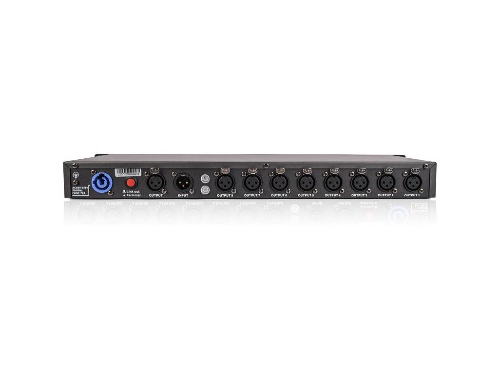 Light4Me Split18 to profesjonalny 8-kanałowy rozdzielacz sygnału DMX z 3-pinowym wejściem i wyjściem XLR DMX, przełącznikiem Link out/Terminal do eliminacji błędów sygnału na długich liniach oraz 8 dodatkowymi wyjściami DMX do podłączenia oświetlenia scenicznego, efektów świetlnych, wytwornic mgły, wyrzutni iskier, konfetti i innych urządzeń z obsługą DMX. Urządzenie idealnie nadaje się do użytku scenicznego i umożliwia jednoczesne sterowanie wieloma urządzeniami za pomocą jednego kontrolera DMX. Dzięki smukłej obudowie ze specjalnymi uchwytami urządzenie Split18 można również zainstalować w standardowej szafie rack 19". Jest to idealne rozwiązanie dla profesjonalnych systemów oświetleniowych, zarówno stacjonarnych, jak i mobilnych.