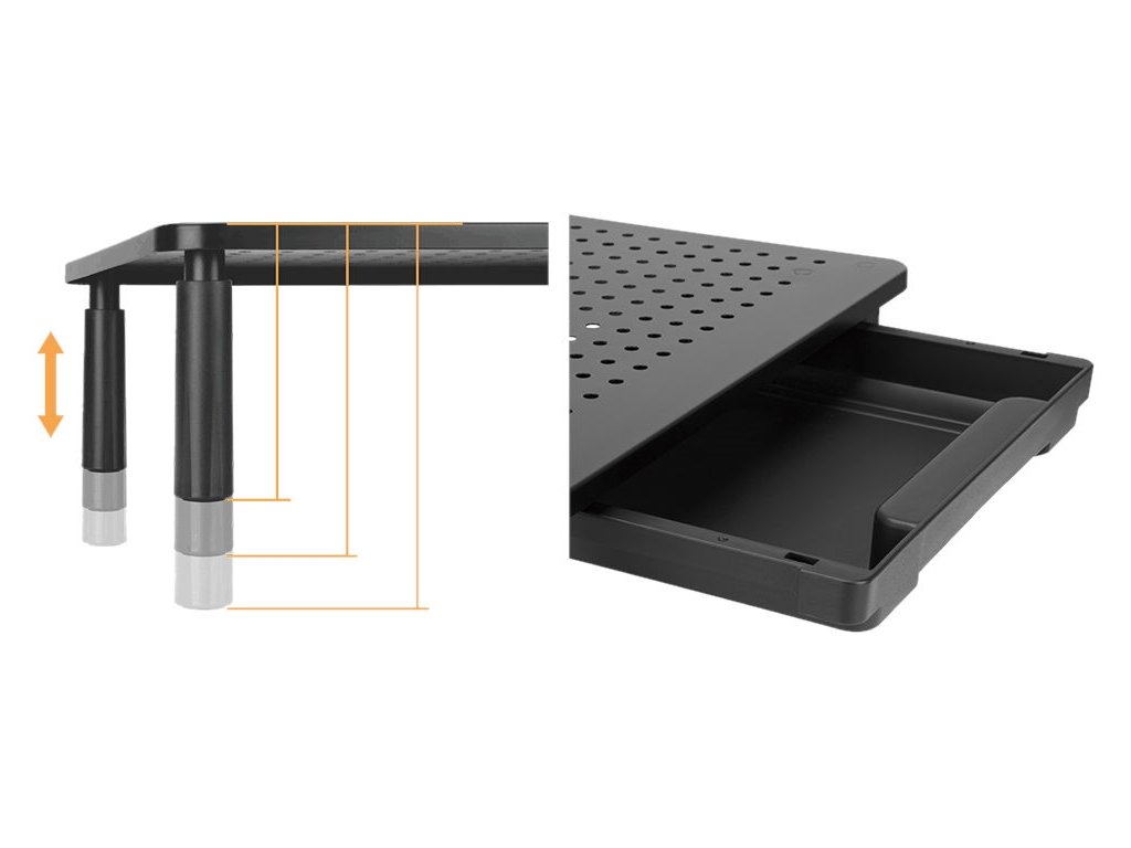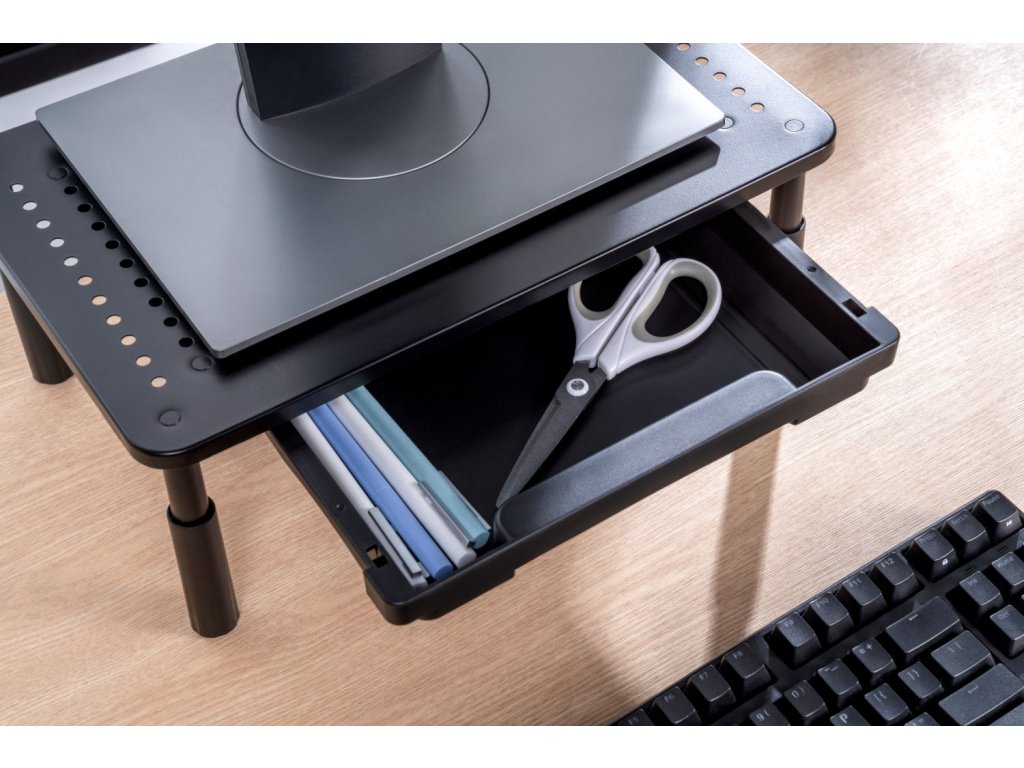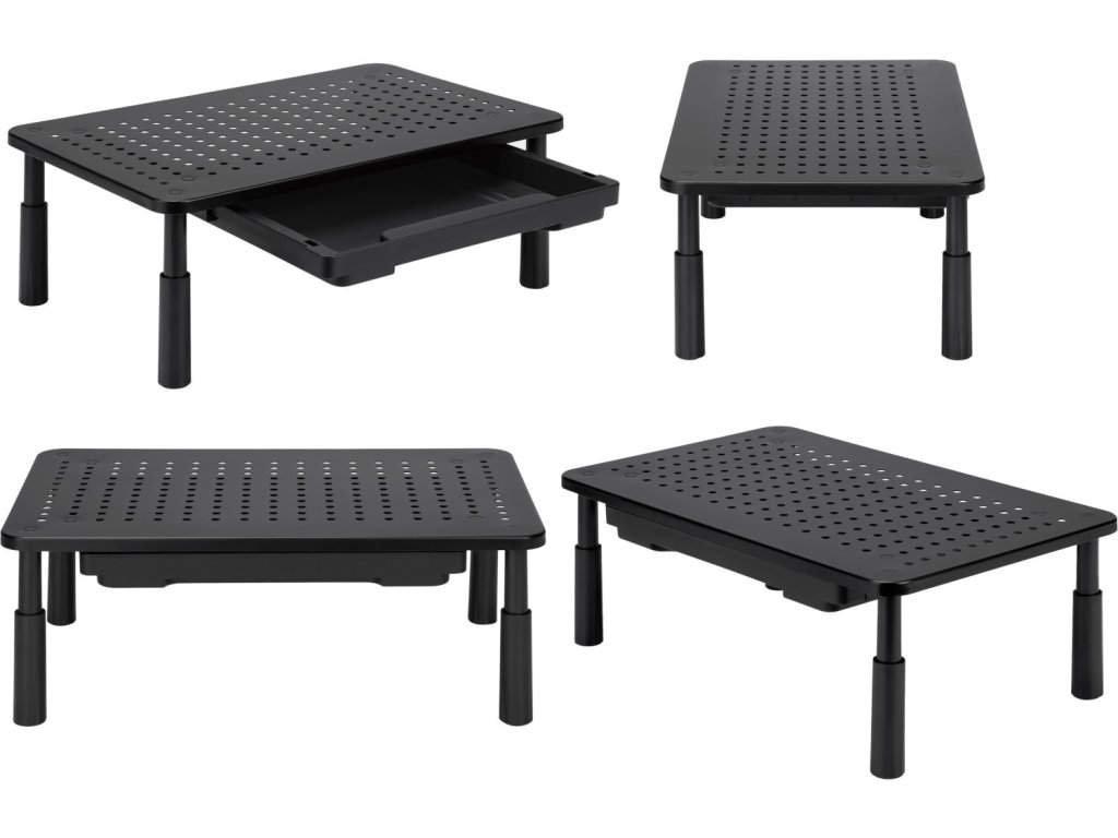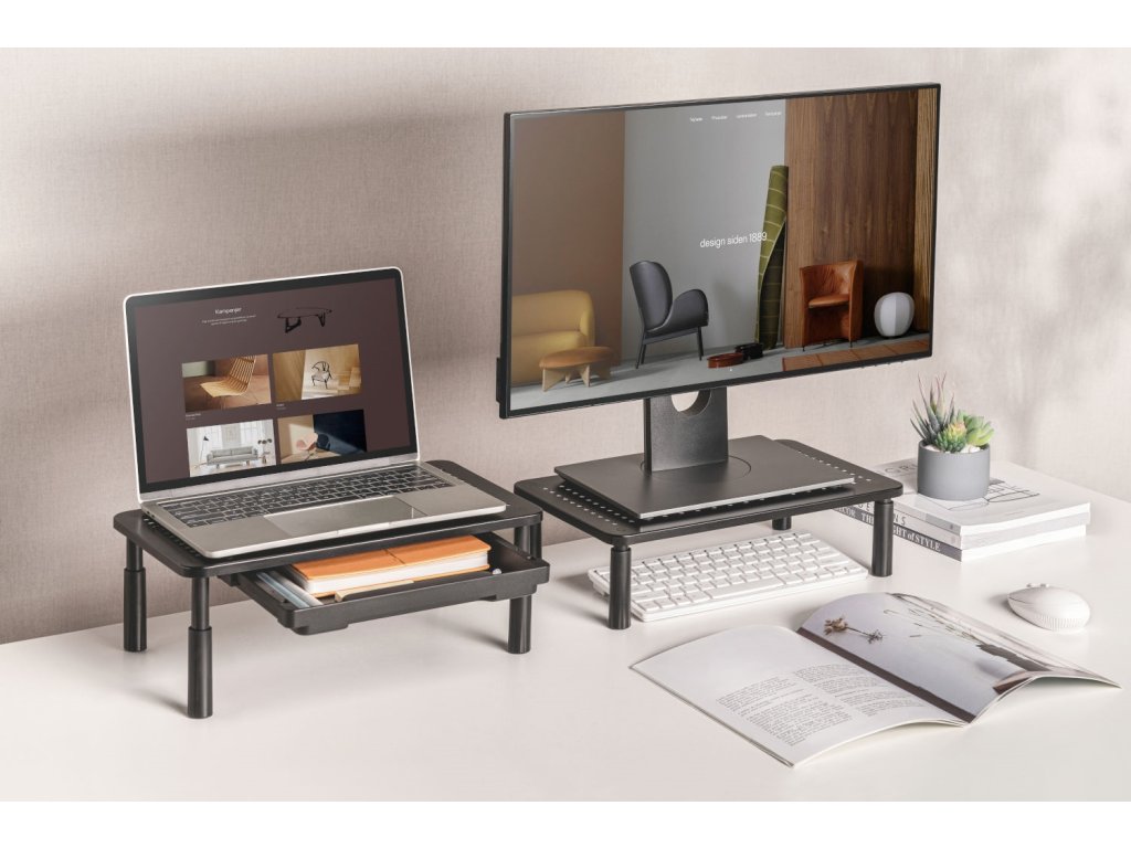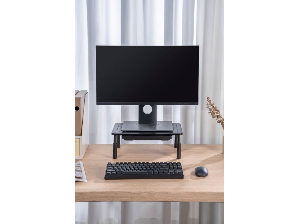 Ergonomiczne rozwiązanie dla Twojego zdrowia: Podnosząc monitor lub notebook na optymalną wysokość, zapobiegasz niepotrzebnemu obciążeniu kręgosłupa szyjnego i ogólnie zwiększasz komfort podczas pracy. Wysokość podstawki można regulować w trzech krokach, dostosowując ją do indywidualnych potrzeb.