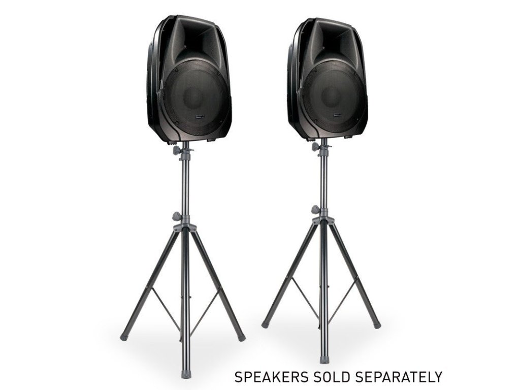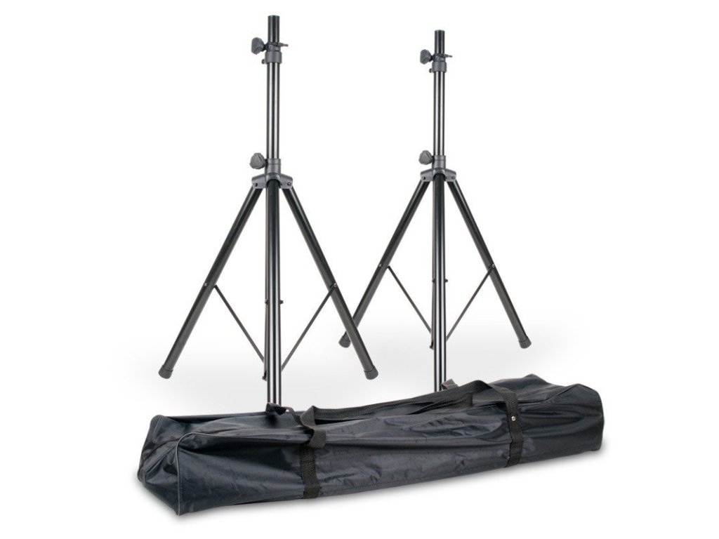 Dwa uniwersalne statywy głośnikowe w futerale transportowym.