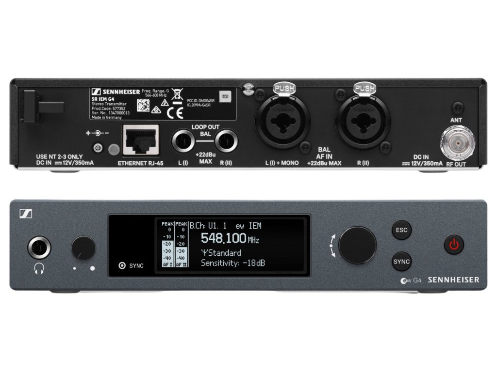 Nadajnik bezprzewodowego systemu evolution wireless IEM G4, oprócz cech przejętych z systemu G3, ma zwiększoną moc nadawania, co zapewnia jeszcze lepsze pokrycie całej przestrzeni. System posiada 20 grup częstotliwości z 16 ustawieniami wstępnymi do natychmiastowego użycia i 1 grupę z możliwością dostrojenia dowolnej częstotliwości w danym zakresie (1680 możliwości).