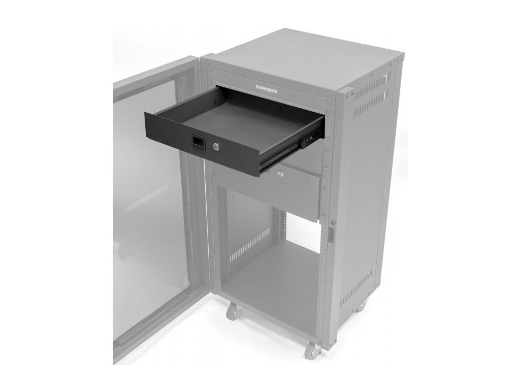Samson SRK DR2U to uniwersalna, metalowa szuflada do racka 19". Umożliwia proste i łatwo dostępne przechowywanie sprzętu, którego nie można umieścić w racku 19" w standardowy sposób. Model SRK DR2U pomieści urządzenia o wysokości dwóch jednostek rackowych i wadze do 22,5 kg. Szuflada jest wykonana z masywnych stalowych blach walcowanych na zimno. Samson SRK DR2U jest również wyposażony w zatrzask sprężynowy i masywne szyny z płynnym i cichym działaniem. Na tylnej stronie szuflady znajdują się przepusty na kable. Szuflada jest zamykana na klucz i dostarczana z kluczem. Chociaż szufladę tę można użyć do dowolnego racka 19", idealnie nadaje się do użytku z rackami Samson SRK.