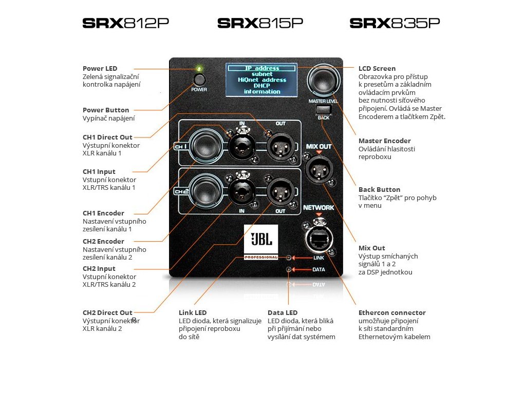 Szerokopasmowy 15-calowy, dwudrożny SRX815P zawiera legendarne przetworniki JBL, opatentowane wzmacniacze Crown Drivecore o mocy 2000 watów, wysokiej klasy konfigurowalny procesor DSP, strojenie V5 kompatybilne z systemami Vertec i VTX oraz możliwość sterowania przez protokół HiQnet za pomocą aplikacji na iOS lub Android.System SRX800 może być używany zarówno samodzielnie, jak i zintegrowany z większą całością, ponieważ jest w pełni kompatybilny z flagowymi systemami JBL.