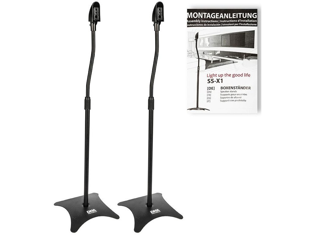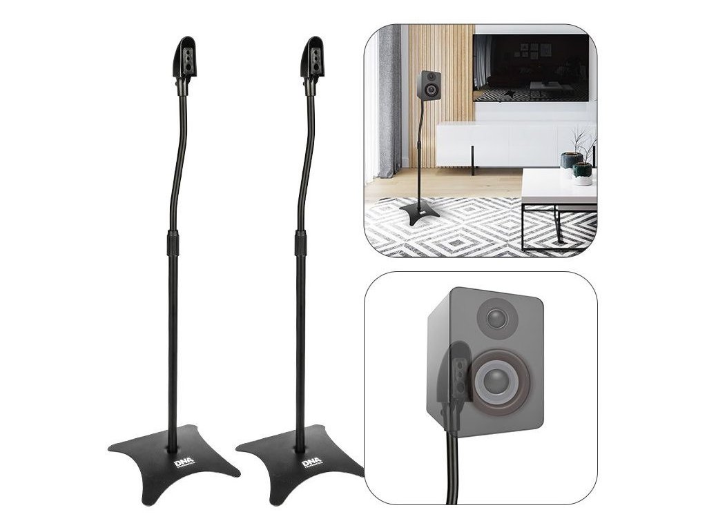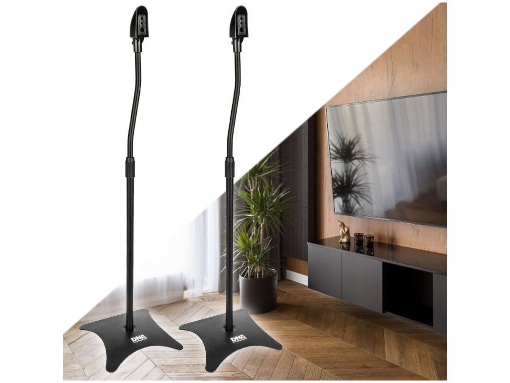 DNA SS 1 SET to zestaw 2 podłogowych statywów głośnikowych z płynną regulacją wysokości od 68 cm do 110 cm. Żeliwne podstawy statywów, dzięki swojej wadze, zapewniają dużą stabilność i gwarantują solidne podparcie dla głośników.