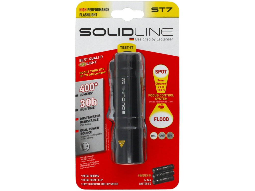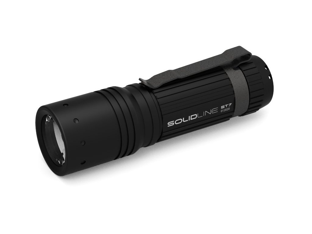 Niezależnie od tego, czy w garażu, czy w piwnicy, na wieczornym spacerze, czy na codziennym spacerze z psem, Solidline ST7 jest niezastąpionym pomocnikiem w życiu codziennym. Ta latarka o doskonałym stosunku ceny do jakości, przeznaczona do szerokiego zakresu zastosowań, zapewnia doskonałe światło w każdych warunkach dzięki swojej jasności, zasięgowi i trwałości. Design jest klasyczny i funkcjonalny. Wytrzymała i odporna na uderzenia obudowa z aluminium lotniczego, prosta obsługa dzięki wyłącznikowi końcowemu i wysoka zmienność dzięki systemowi Focus Control System. Połączenie soczewki i reflektora stworzyło unikalną technologię Advanced Focus System, która nie ma sobie równych na świecie. W ten sposób powstała soczewka reflektorowa umożliwiająca skupienie strumienia światła z płynnym przejściem od szerokiego, homogenicznego kręgu światła do ostrej wiązki i odwrotnie. Ostrość dzięki technologii Rapid Focus jest bardzo szybka i odbywa się poprzez proste przesunięcie głowicy latarki do przodu (ostrość) lub do tyłu (rozmycie). Latarki Solidline wykorzystują zasadę załamania światła. Zwykłe latarki jedynie odbijają światło od powierzchni odblaskowych wewnątrz głowicy latarki. Zasilanie latarki zapewniają 3 alkaliczne baterie AAA. Dodatkowo latarka posiada praktyczny klips do przymocowania do paska lub kieszeni koszuli.