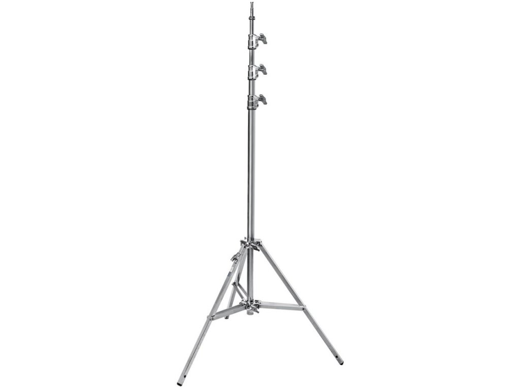Chromowany stalowy statyw z 4 sekcjami. Statyw udźwignie maksymalne obciążenie 9 kg i osiąga maksymalną wysokość 4,50 m. Statyw jest wyposażony w 1 poziomującą nóżkę ułatwiającą obsługę na nierównej powierzchni. Jest również wyposażony w górny wspornik o średnicy 5/8'' (16 mm).