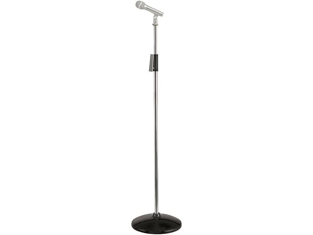 Aluminiowy statyw mikrofonowy, wysokość po złożeniu 108 cm, maksymalna wysokość 195 cm, waga 0,7 kg, obciążenie 2 kg, trzpień typu 36, chromowane wykończenie.