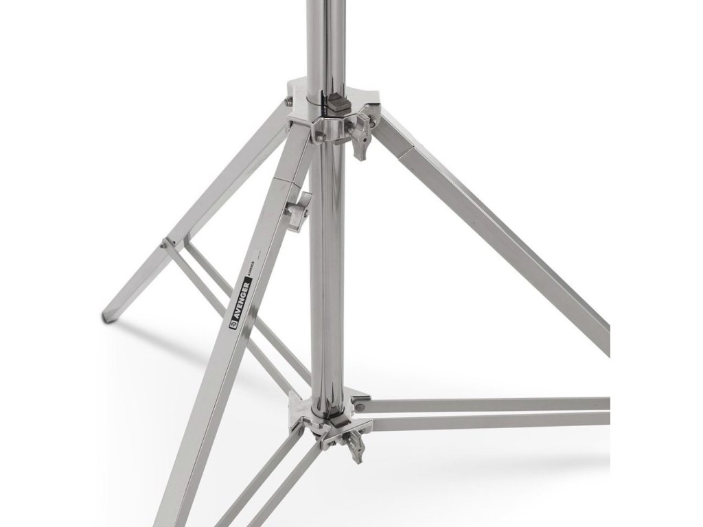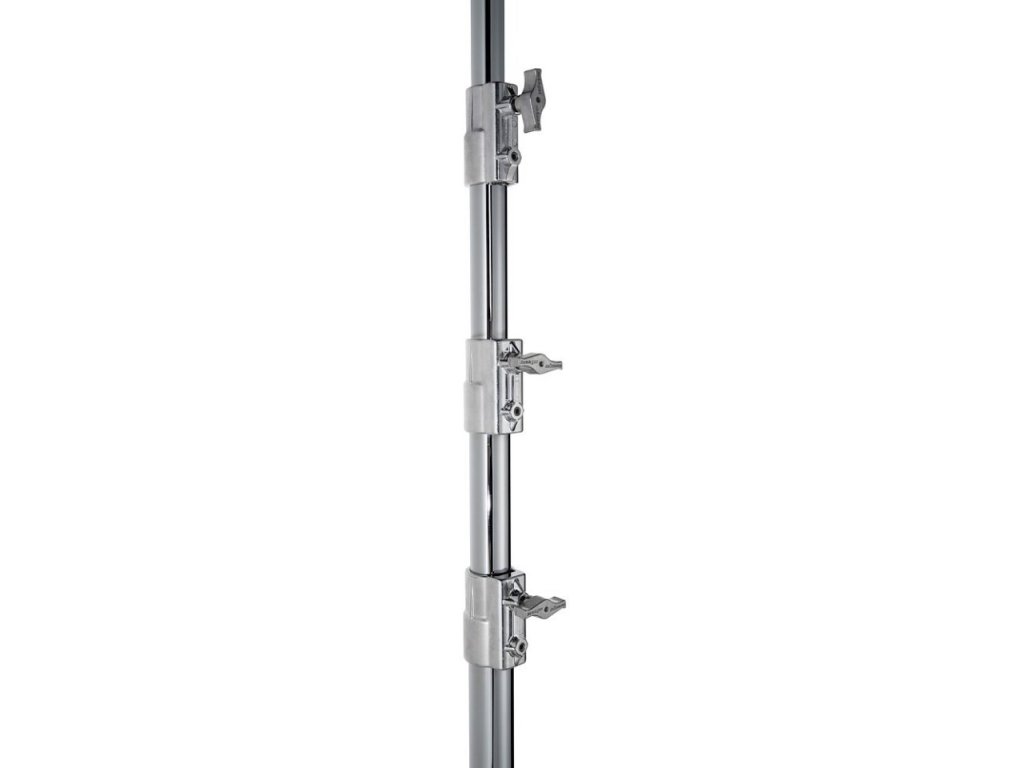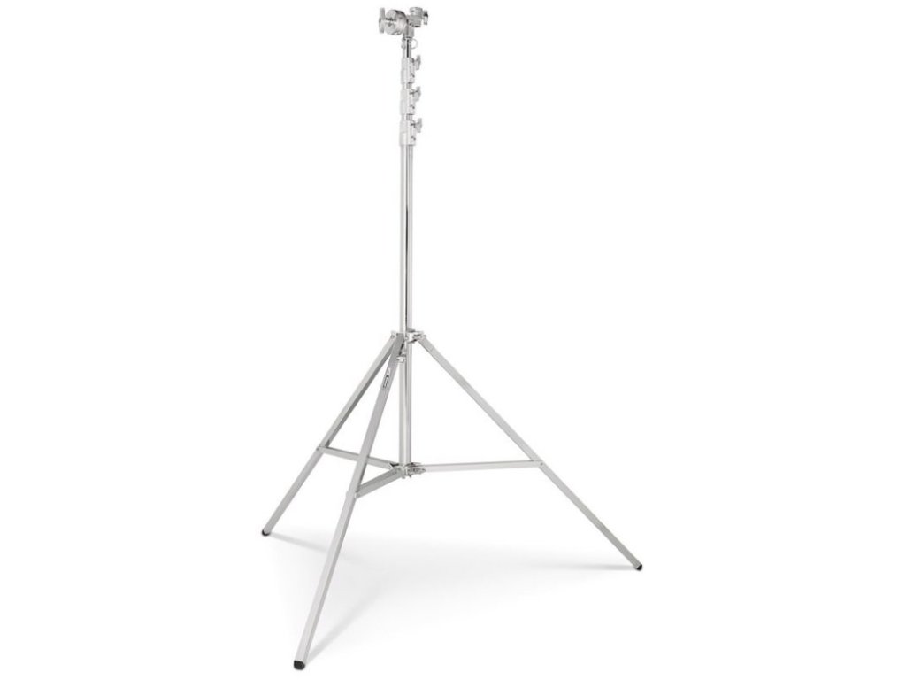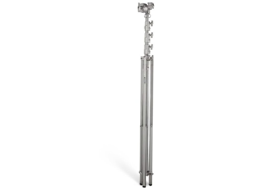 Statyw z wbudowaną głowicą chwytającą do podpierania słupów, rur i górnych ram. Ten statyw z chromowanej stali ma 5 sekcji. Jest wyposażony w 2 nóżki poziomujące do użytku na nierównym terenie. Ten statyw udźwignie maksymalne obciążenie 30 kg i osiągnie maksymalną wysokość 6,38 m.