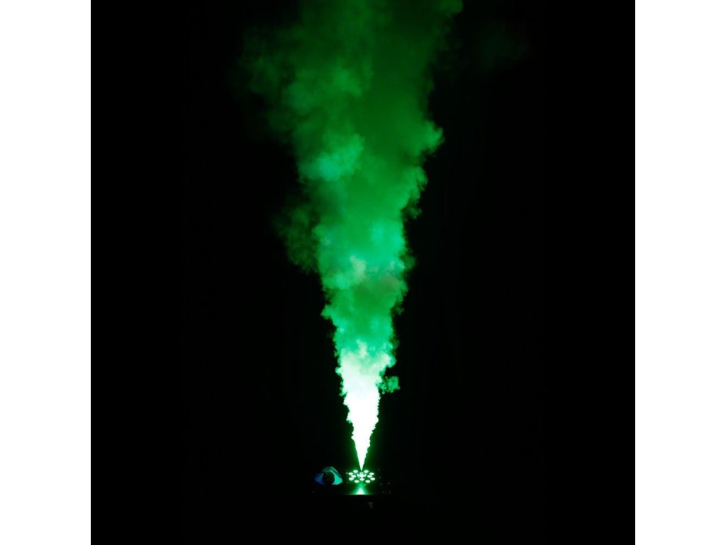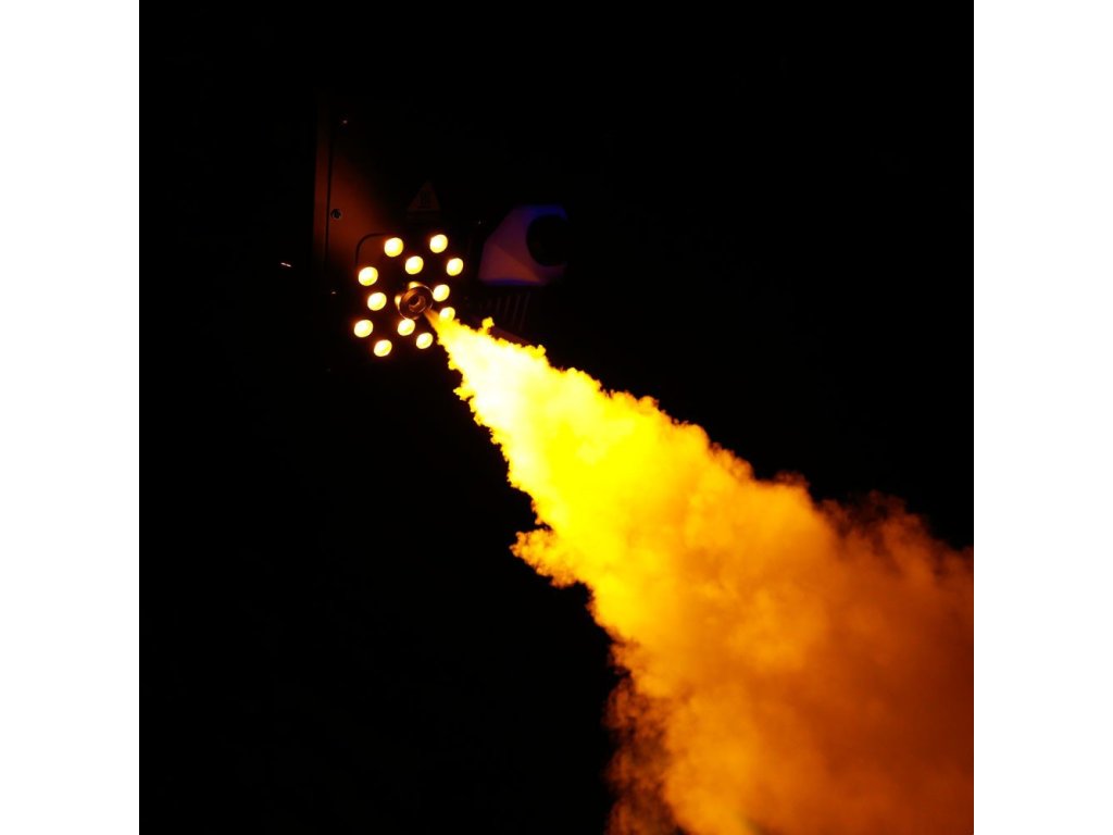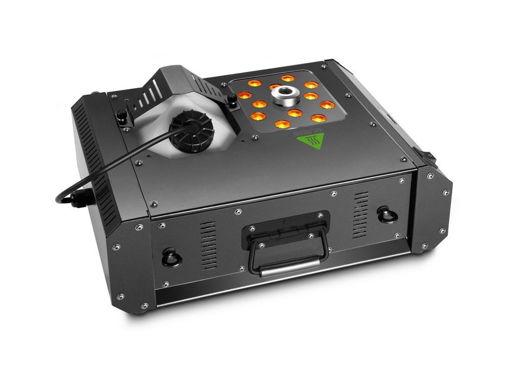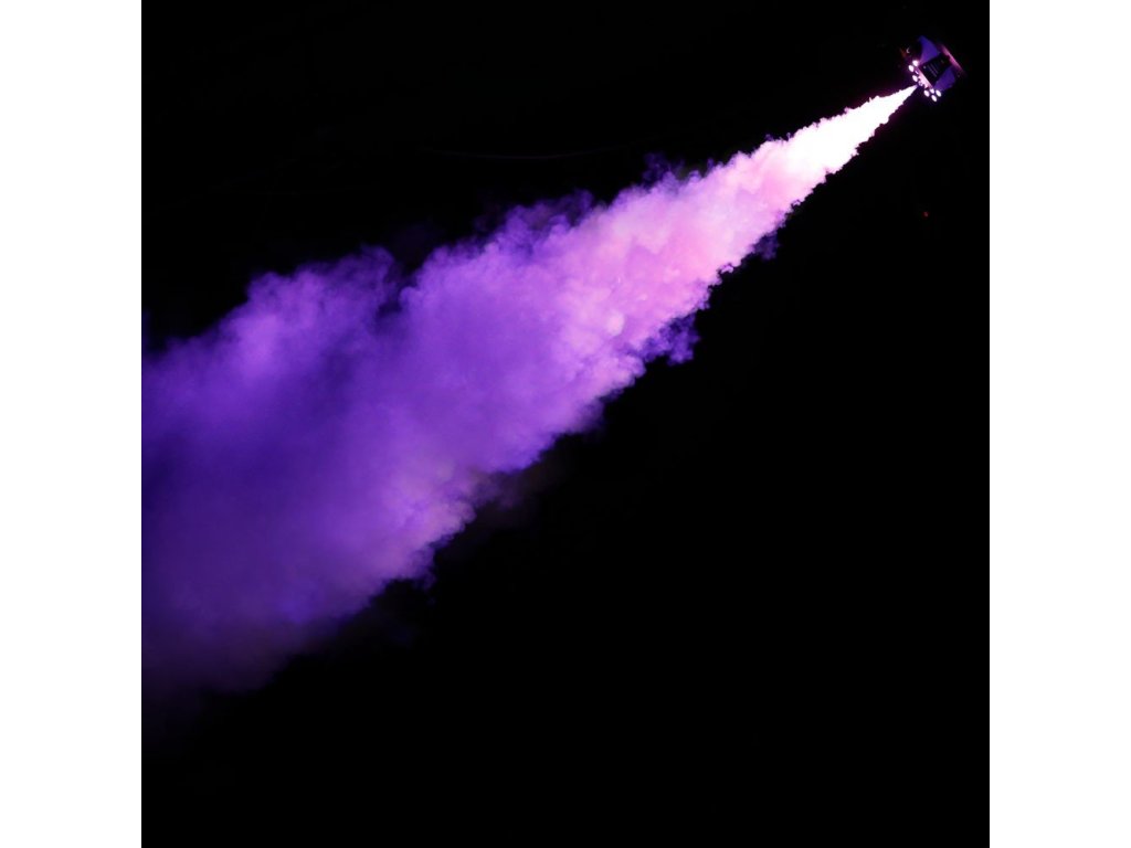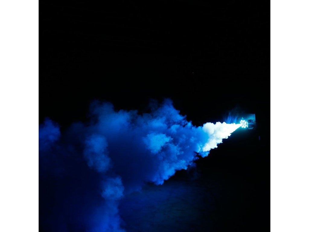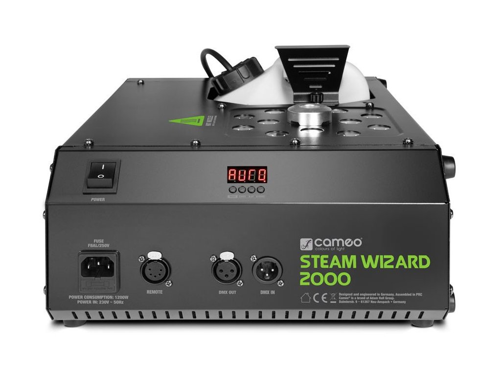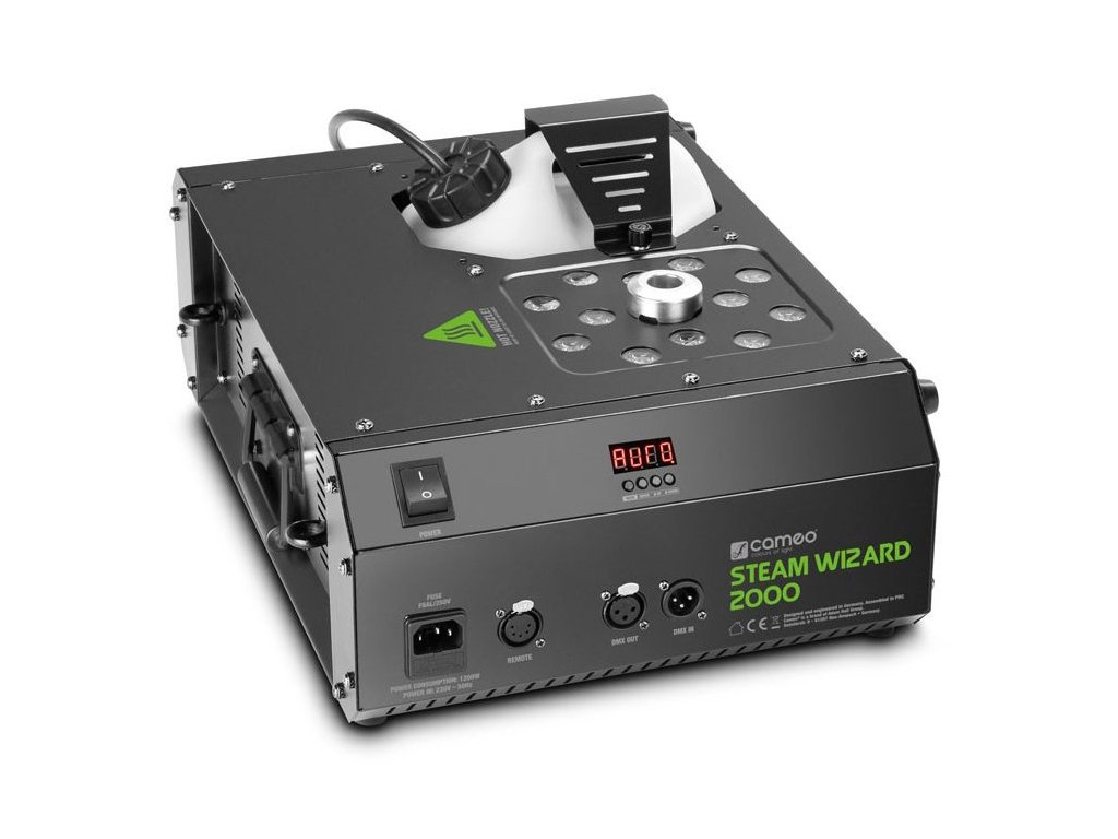Cameo STEAM WIZARD 2000: Wytwornica mgły z diodami LED RGBA do kolorowych efektów mgielnych. Wytwarza gęste, równomierne wybuchy mgły wodnej o długości 7 metrów, które są jednocześnie oświetlane przez 12 wydajnych diod LED 10W 4w1. Dzięki 2 możliwościom umieszczenia zbiornika można go używać na ziemi jako ja zawieszony nad głową. Może być również montowany poziomo. Steam Wizard 2000 wykorzystuje wydajny element grzewczy o mocy 1200W i wysokowydajną pompę, która zapewnia stałą wydajność przy minimalnym czasie nagrzewania. Wskaźnik LED do wskazywania stanu pracy i stanu poziomu cieczy. Funkcja automatycznego wyłączania zapobiega uszkodzeniu pompy, gdy ciecz jest pusta. Steam Wizard 2000 jest sterowany za pomocą DMX w 4-kanałowym trybie z funkcjami: colour jump, Dimmer, output level, strobe, colour change, colour fade lub za pomocą pilota zdalnego sterowania z podświetlanymi przyciskami i obrotowymi pokrętłami, które umożliwiają łatwą widoczność w ciemności. Pilot zdalnego sterowania jest częścią zestawu.