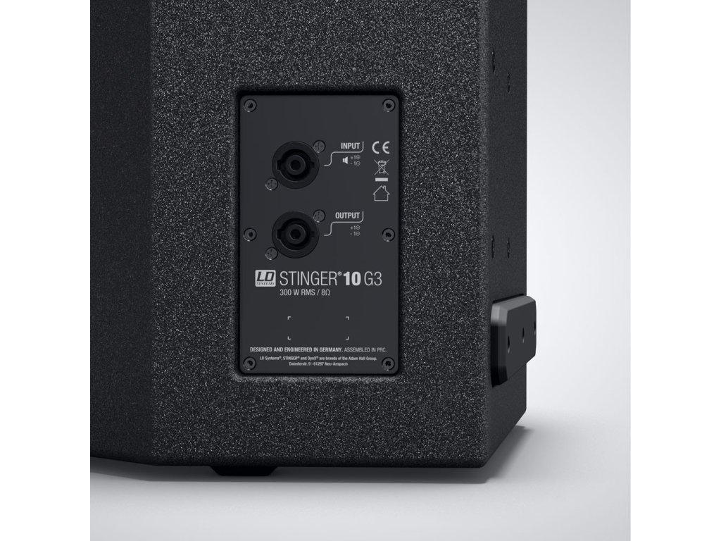 Ten wysoce profesjonalny 2-drożny głośnik został zaprojektowany z myślą o absolutnej, długotrwałej niezawodności. Dzięki wielofunkcyjnej obudowie bass reflex jako pełnowartościowemu głośnikowi, satelicie i monitorowi podłogowemu nadaje się do mobilnych i stacjonarnych systemów PA. Urządzenie Stinger® 10 G3 zapewnia 300 watów mocy ciągłej; maksymalny poziom ciśnienia akustycznego wynosi 120 dB. Specjalnie opracowany 10" głośnik niskotonowy i driver BMS HF zapewniają mocną reprodukcję basów i świeże, naturalne tony wysokie.