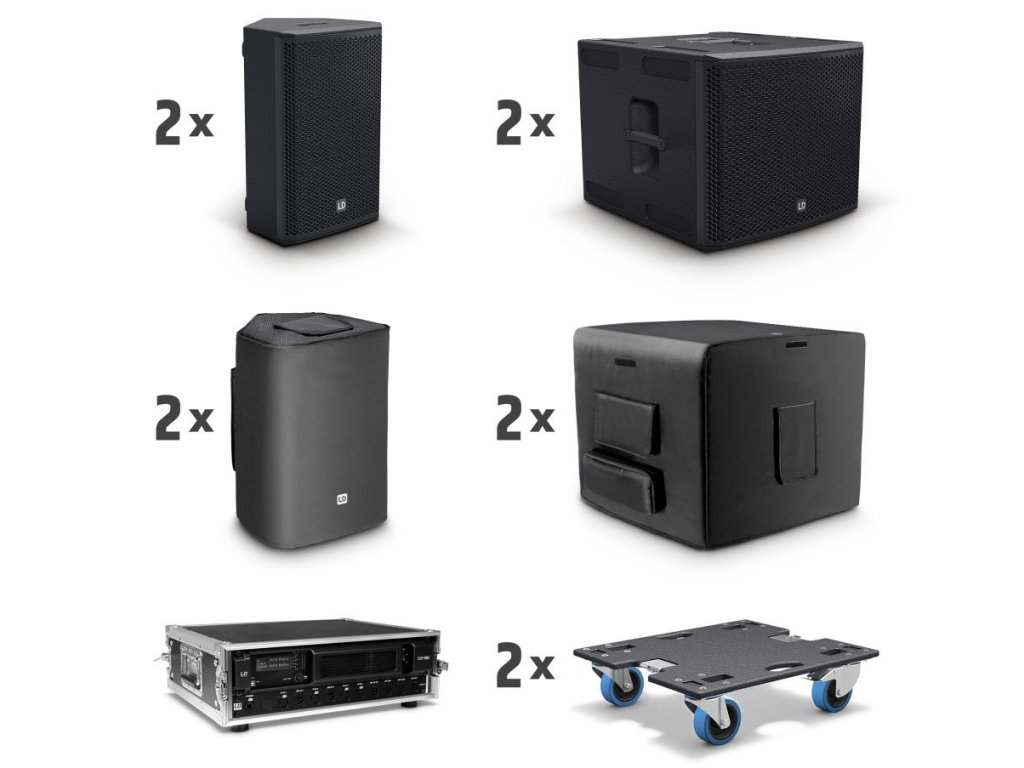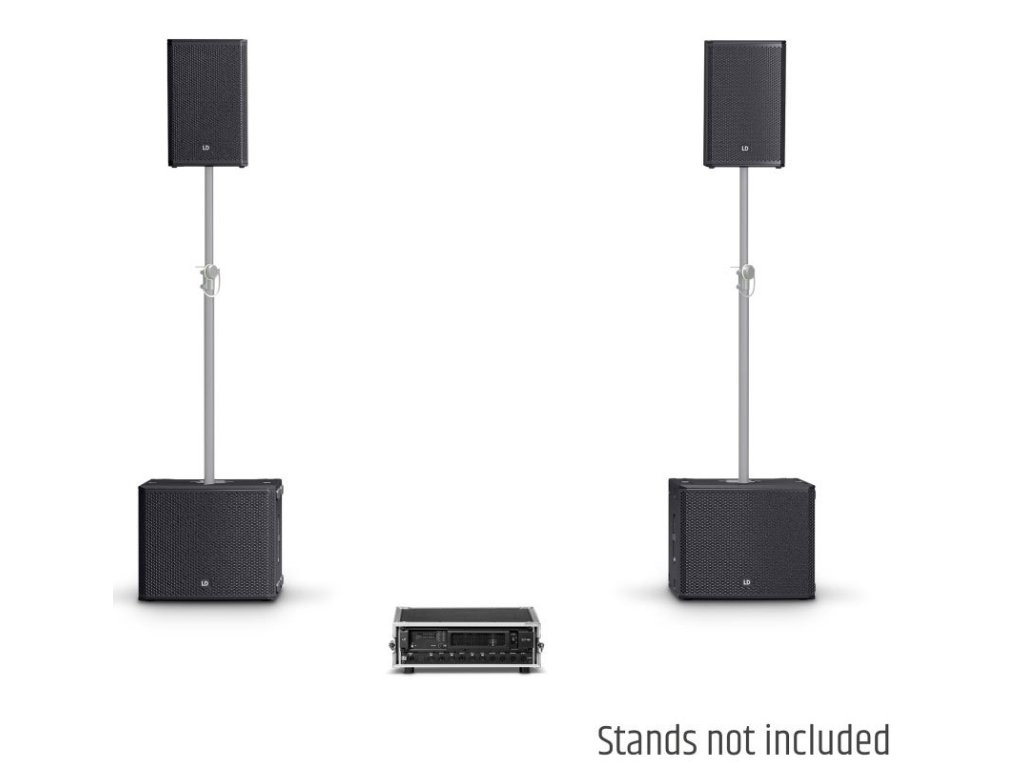 Zestaw kolumnowy składający się z 2 x 10" pasywnego głośnika PA + 2 x 15" pasywnego subwoofera + Wzmacniacz w racku.