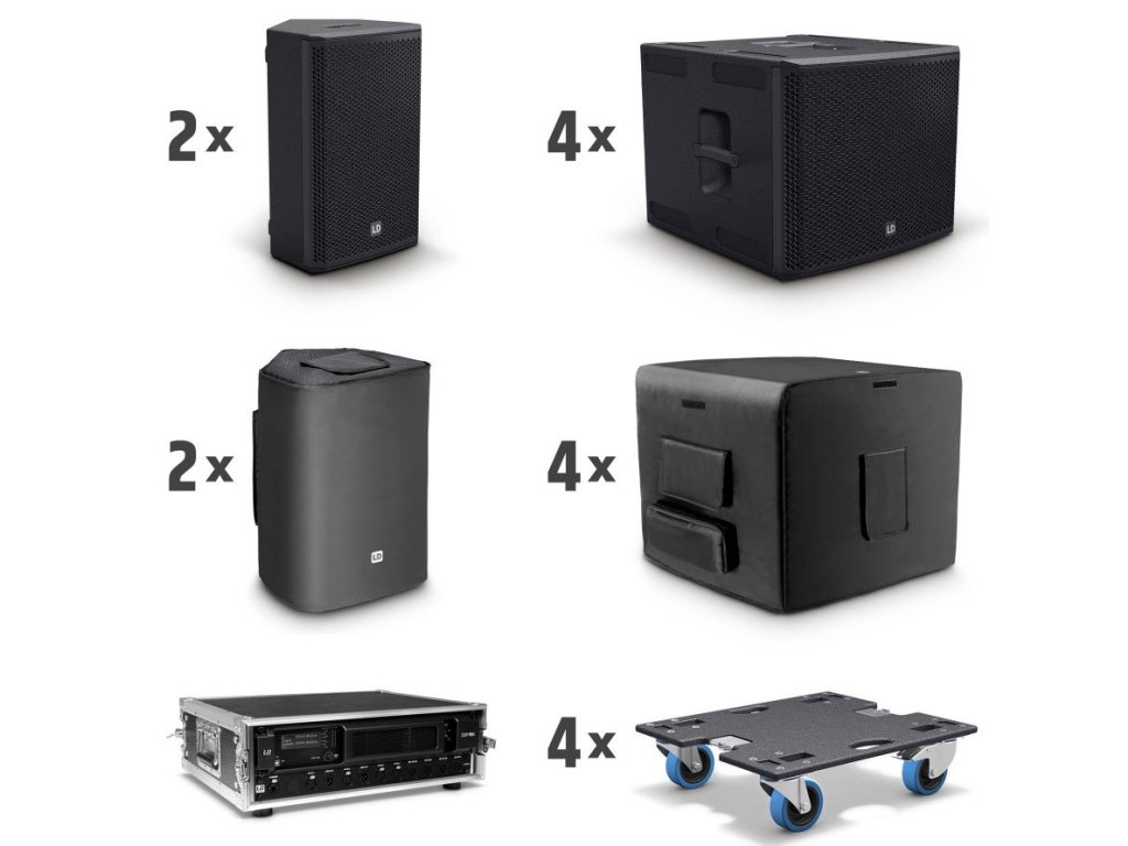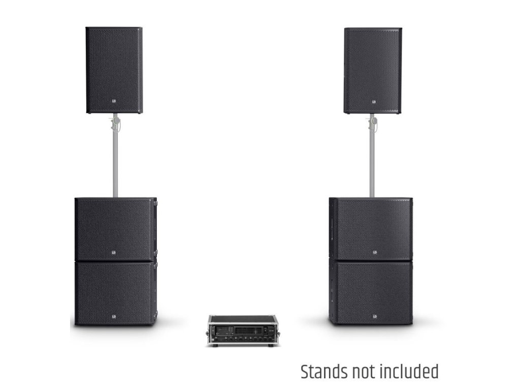 Pasywny zestaw głośnikowy, który zawiera 2 x 15" pasywny głośnik PA + 4 x 18" pasywny subwoofer + Rack ze wzmacniaczem.