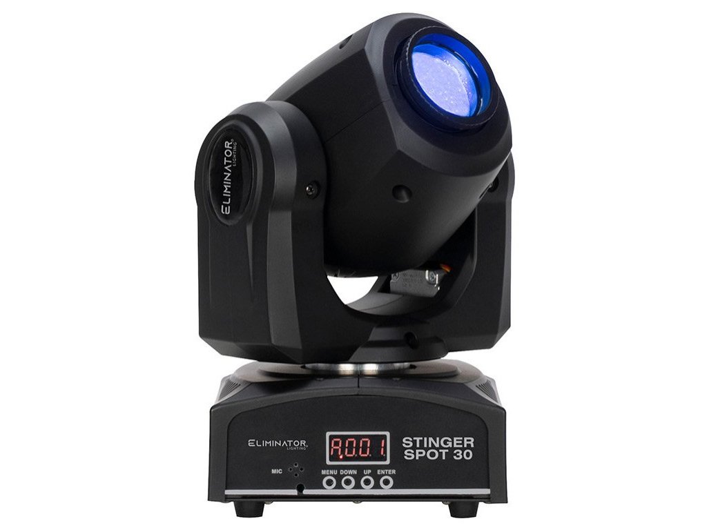 Eliminator Lighting Stinger Spot 30 to mini głowica ruchoma z ostrym źródłem LED o mocy 30 W i zaawansowaną optyką. Dzięki kompaktowym rozmiarom i niskiej wadze idealnie nadaje się dla mobilnych artystów estradowych, małych klubów i barów, lodowisk, kręgielni lub dowolnej mobilnej produkcji.