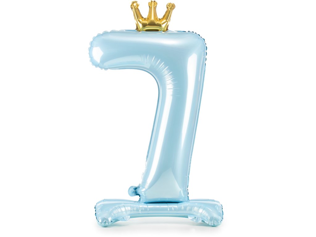 Balon stojący z metalizowanej folii numer "7" w kolorze błękitnym z koroną w kolorze złotym, wielkość przed napompowaniem ok. 103 cm (40,5''), wielkość po napompowaniu 84 cm (33''). Napompuj powietrzem.