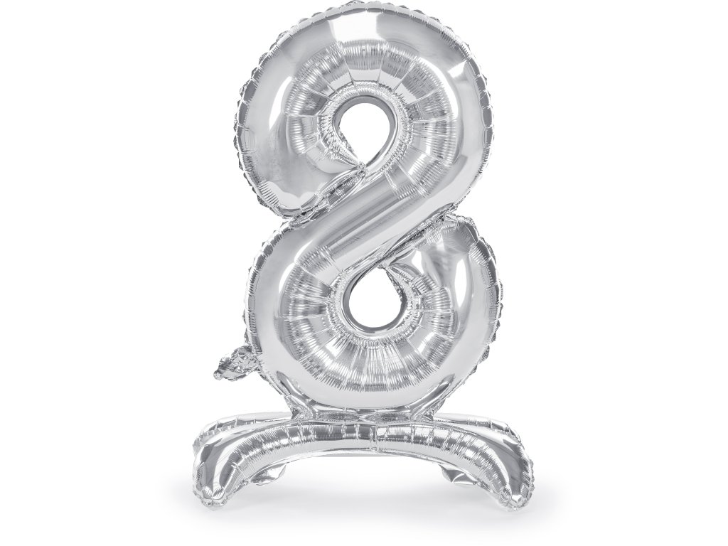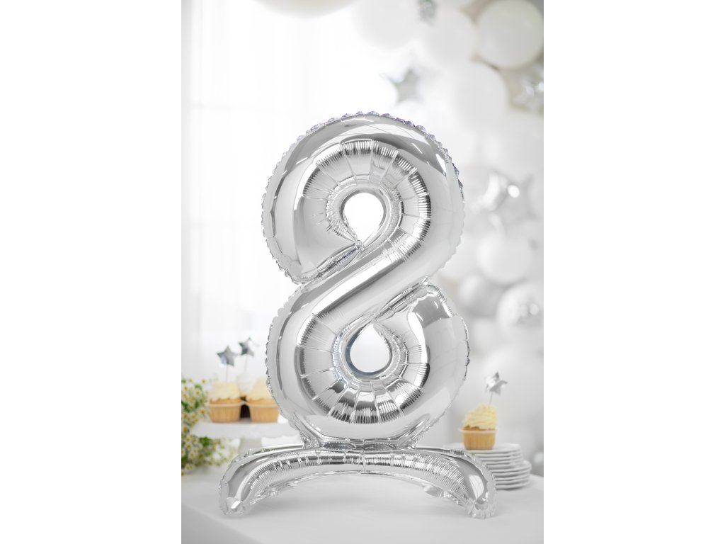 Balon stojący numer ''8'' w kolorze srebrnym, rozmiar przed napompowaniem ok. 90 cm (35''), rozmiar po napompowaniu ok. 70 cm (27,5''). Napompuj powietrzem.