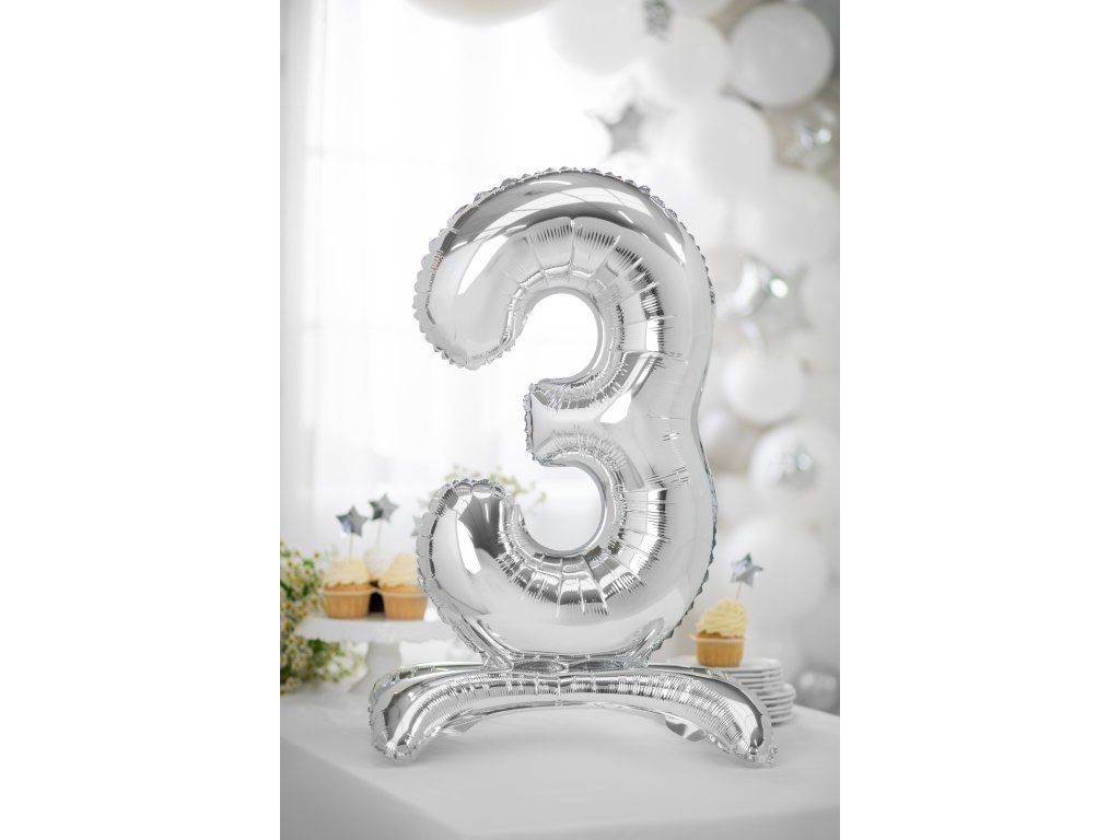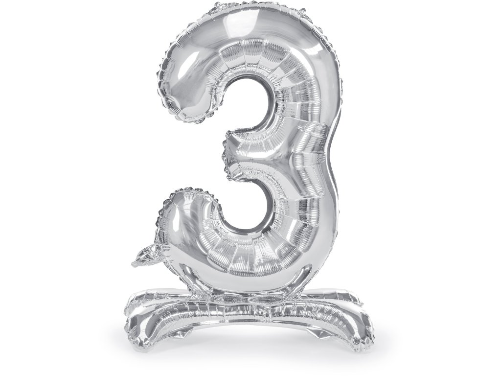 Balon stojący numer ''3'' w kolorze srebrnym, rozmiar przed napompowaniem ok. 90 cm (35''), rozmiar po napompowaniu ok. 70 cm (27,5''). Napompuj powietrzem.
