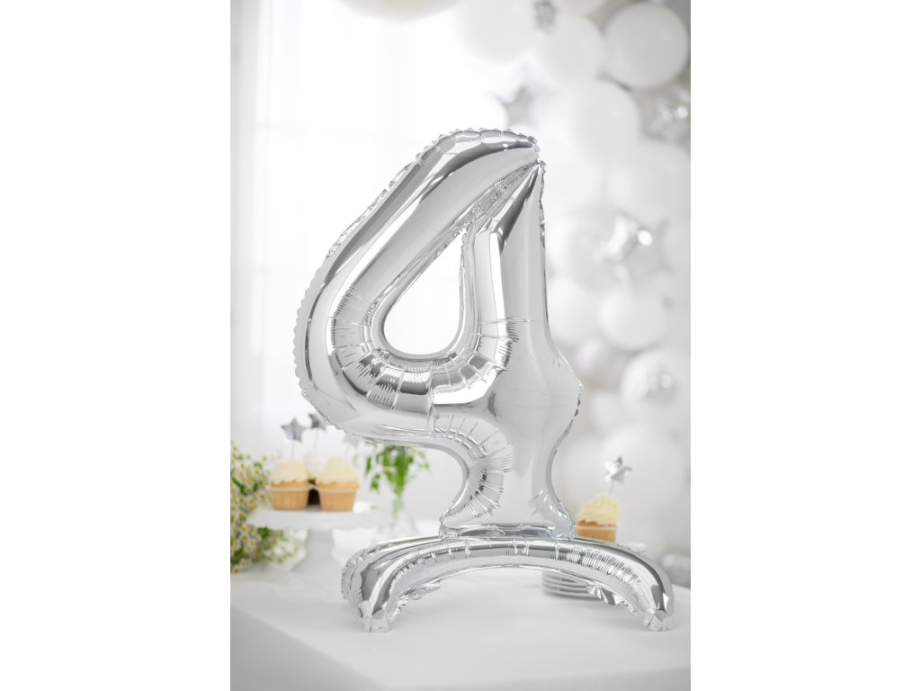 Balon stojący cyfra "4" w kolorze srebrnym, wielkość przed napompowaniem ok. 90 cm, wielkość po napompowaniu ok. 70 cm. Napompuj powietrzem.