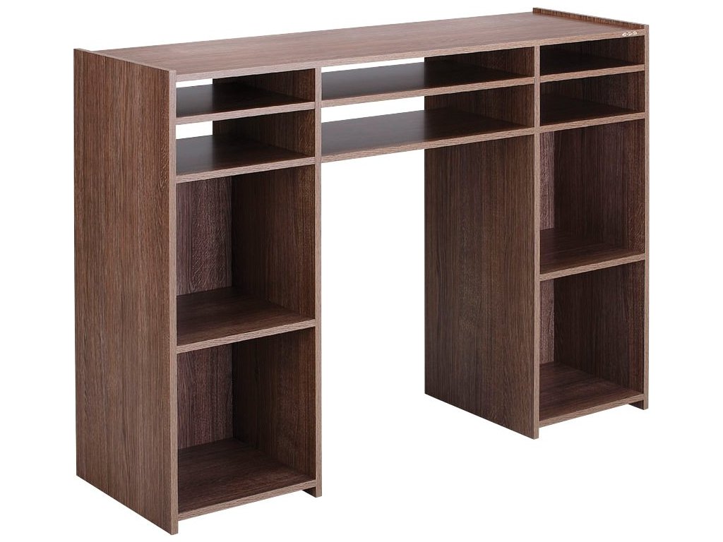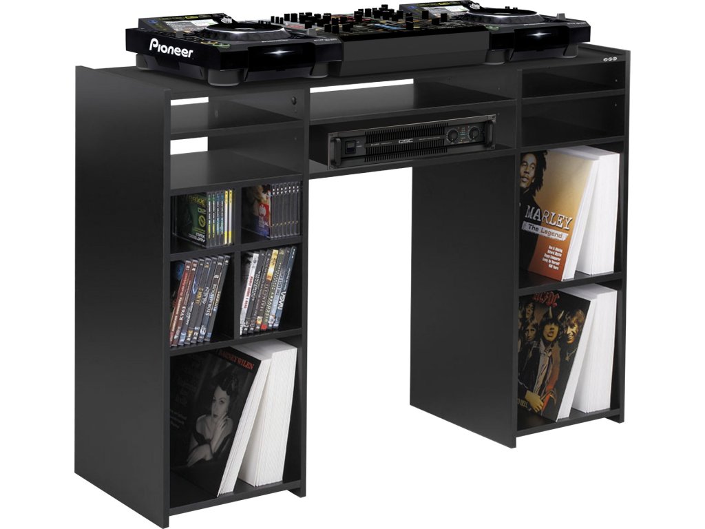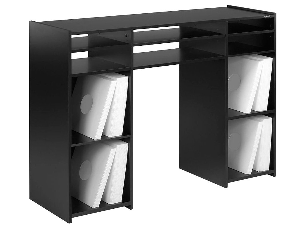 Profesjonalny stół DJ-ski, który zawiera również półki do przechowywania płyt winylowych.