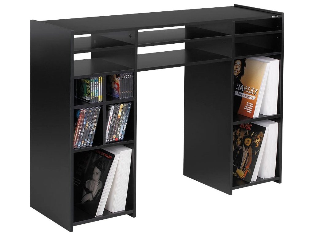 Profesjonalny stół DJ-ski, który zawiera również półki do przechowywania płyt winylowych.