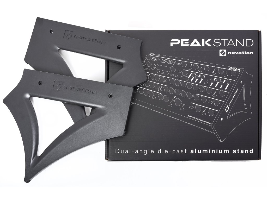Aluminiowe panele boczne do Novation Peak. Dwa rodzaje instalacji umożliwiają ustawienie instrumentu pod dwoma różnymi kątami. W zestawie znajdują się cztery śrubki.