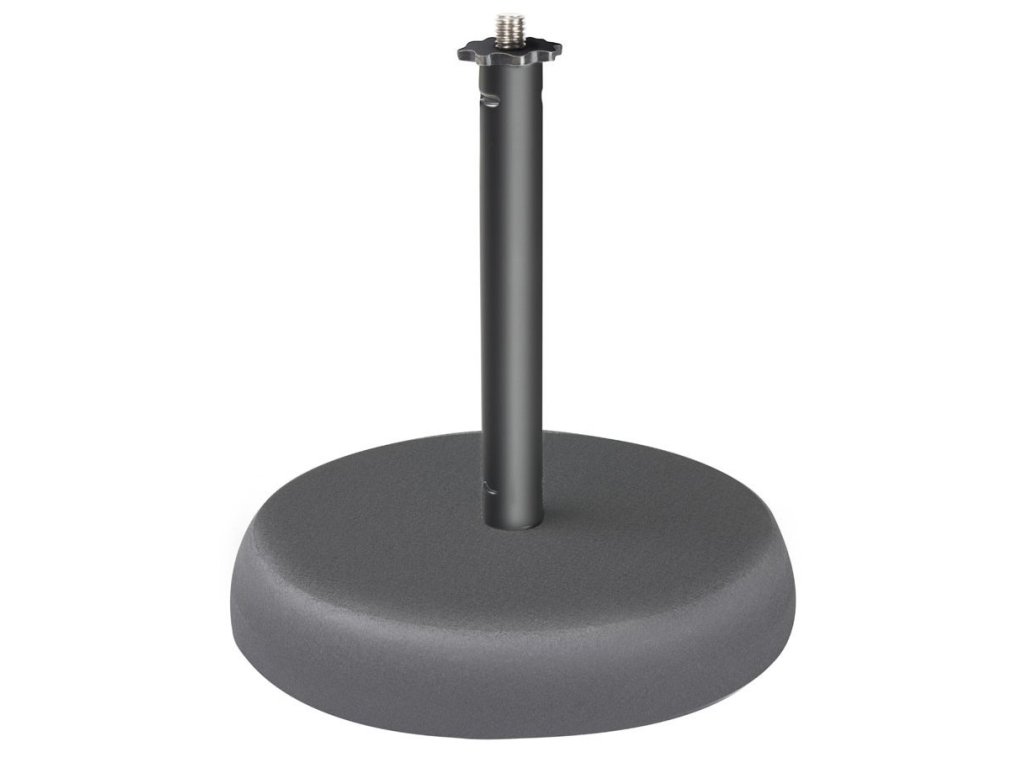Stojak mikrofonowy biurkowy z okrągłą podstawą.