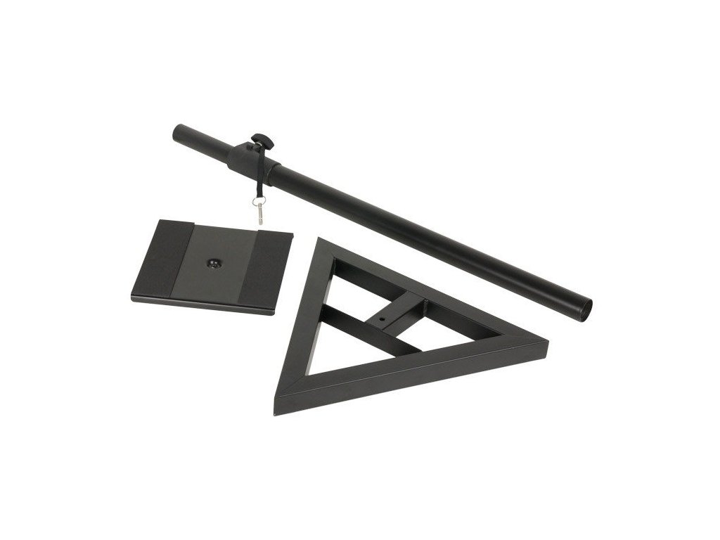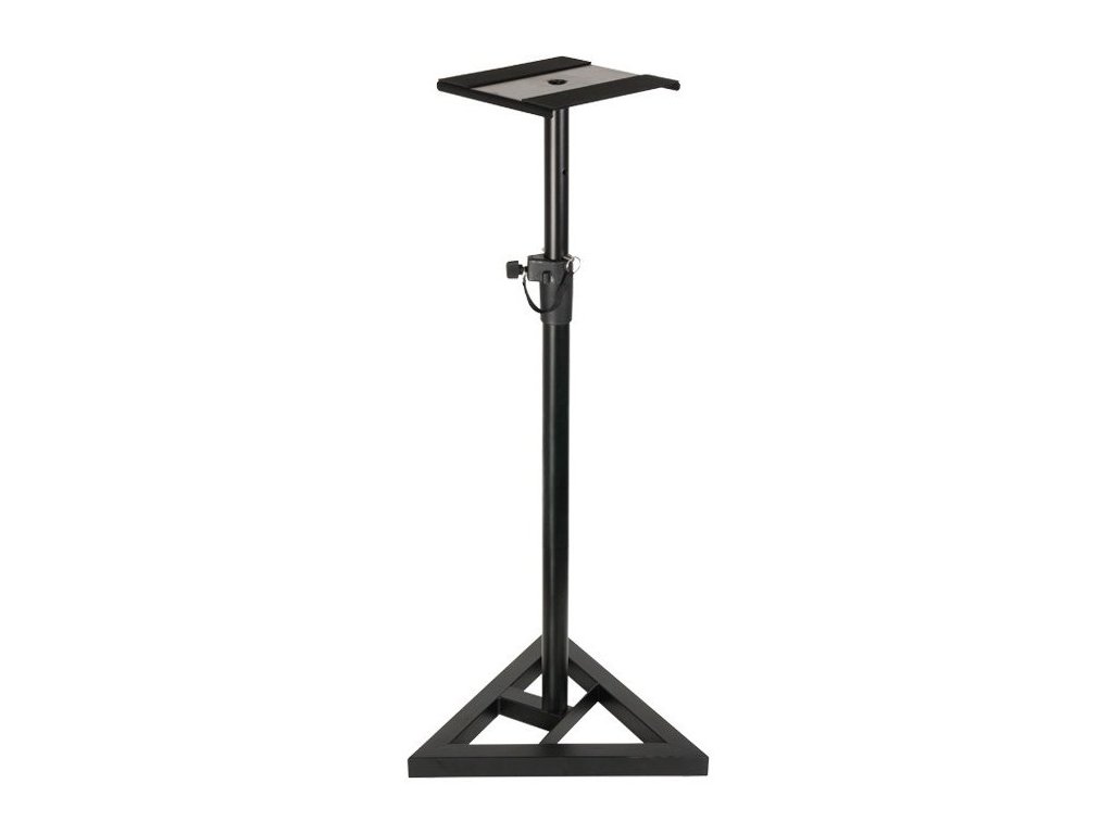 Stojak z regulacją wysokości do monitora studyjnego. Stalowa podkładka z pianką izolacyjną. Wysokość regulowana skokowo co 12 cm od 91,5 cm do 150 cm. Zwiększone bezpieczeństwo zapewnia śruba T i kołek zabezpieczający. Rury 35/40 mm, malowane proszkowo na czarno. Zawiera śruby montażowe, klucz imbusowy, plastikowe nóżki i stalowy kolec.