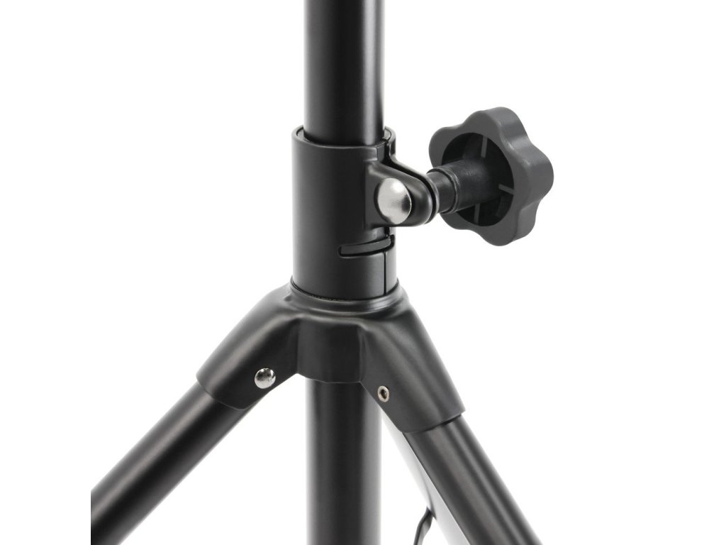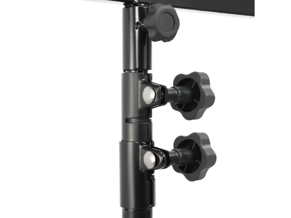 Lekki, solidny statyw oświetleniowy z 2 wysuwanymi sekcjami i poprzeczką T. Dostarczany w zestawie z 4 śrubami z podkładkami i nakrętkami motylkowymi.