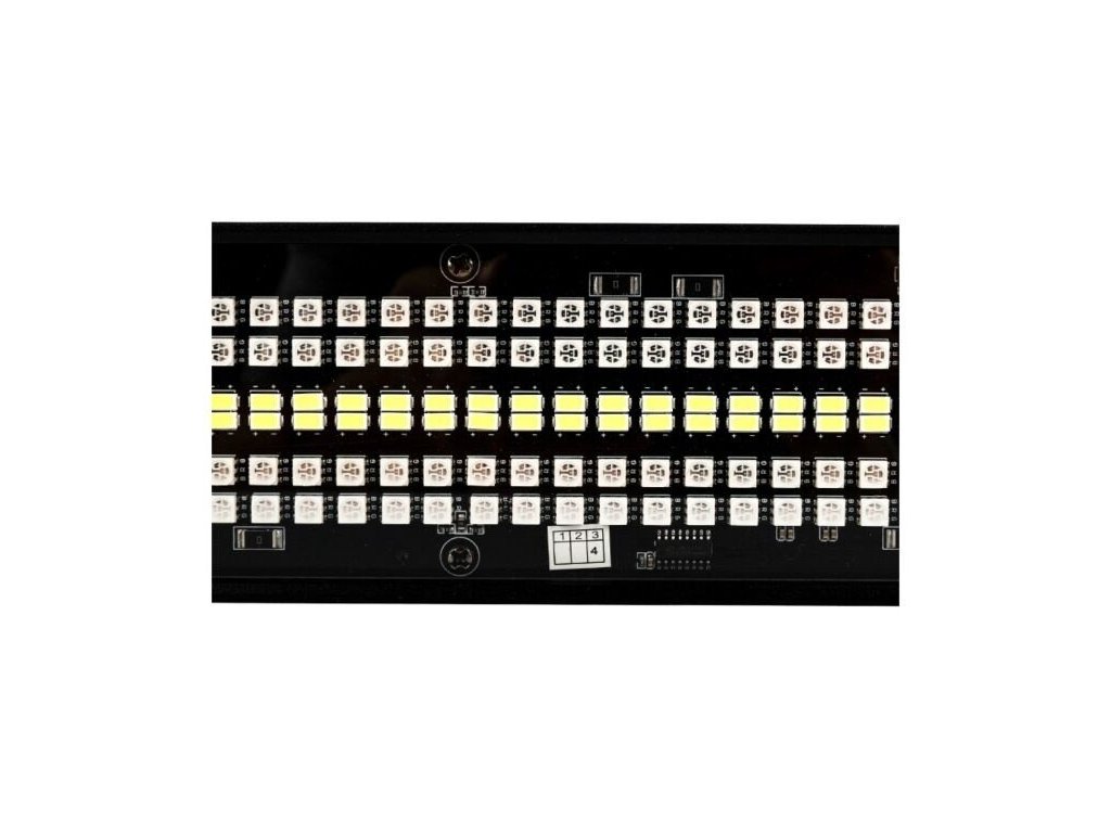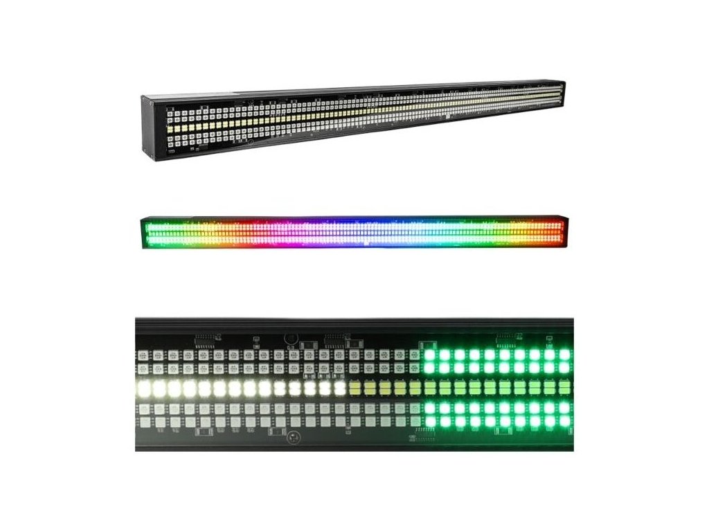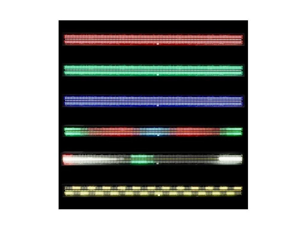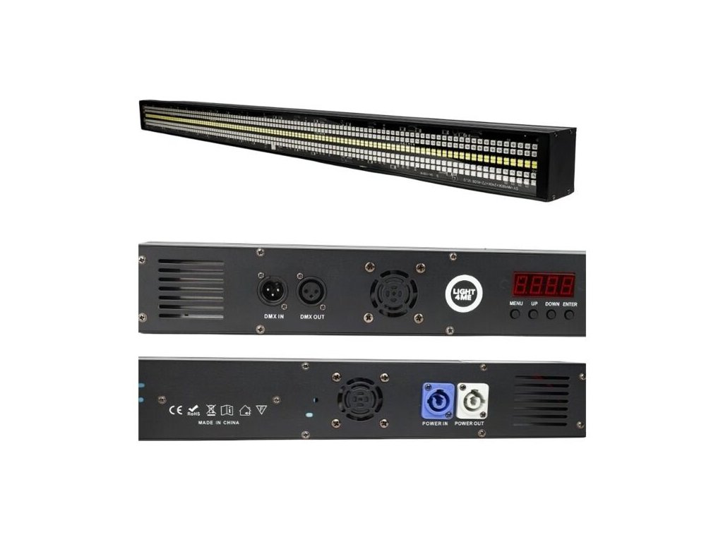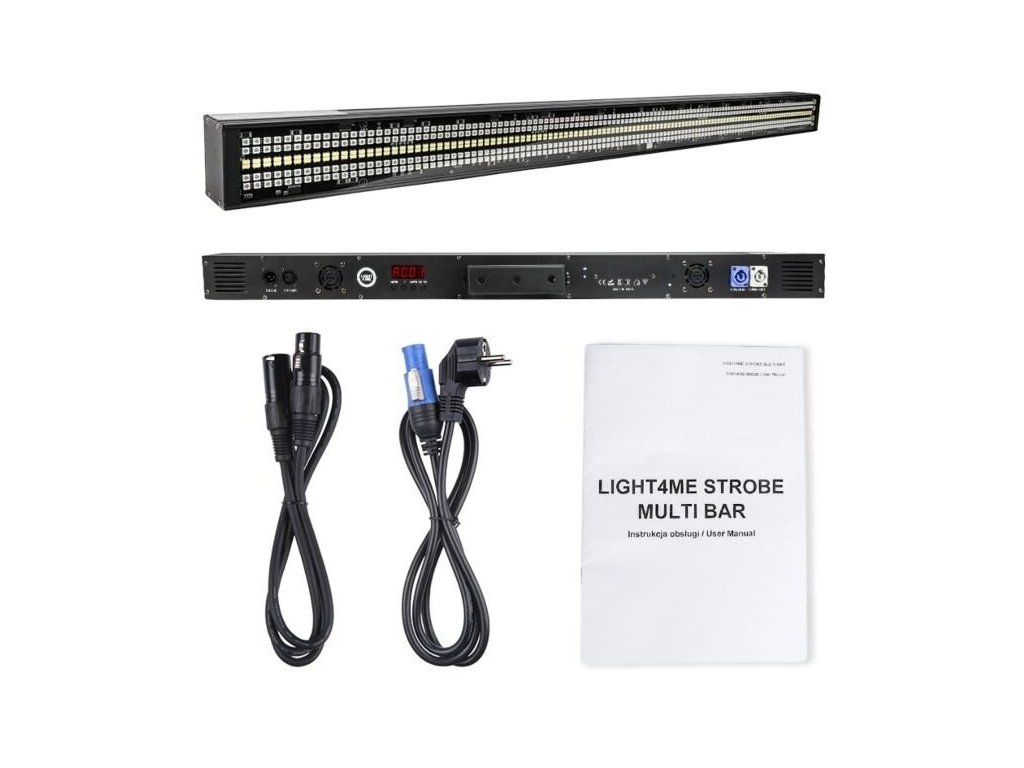 LIGHT4ME Strobe Multi Bar to profesjonalny stroboskop LED przeznaczony do użytku na małych i średnich scenach. Dzięki swojej wydajności i wysokiej jakości wykonania urządzenie nadaje się również do dekoracji świetlnych lub oświetlenia architektonicznego. Panel świetlny urządzenia pracuje w palecie kolorów RGB+CW, czyli kombinacji czerwonego, zielonego, niebieskiego i zimnego białego. Panel zawiera 480 diod RGB LED o mocy 0,3 W, podzielonych na 48 sekcji po 10 diod w górnej i dolnej części. Środkowy pas panelu świetlnego jest wyposażony w 240 diod LED SMD5730 (zimna biel) o mocy 0,3 W, również ułożonych w 24 sekcjach.