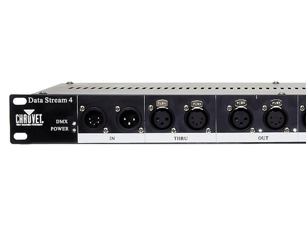Data Stream 4 uniwersalny splitter optyczny pracujący z protokołem DMX-512. Został zaprojektowany tak, aby odbierany sygnał dystrybuował do 4 oddzielnych wyjść i jednego dodatkowego wyjścia Thru.