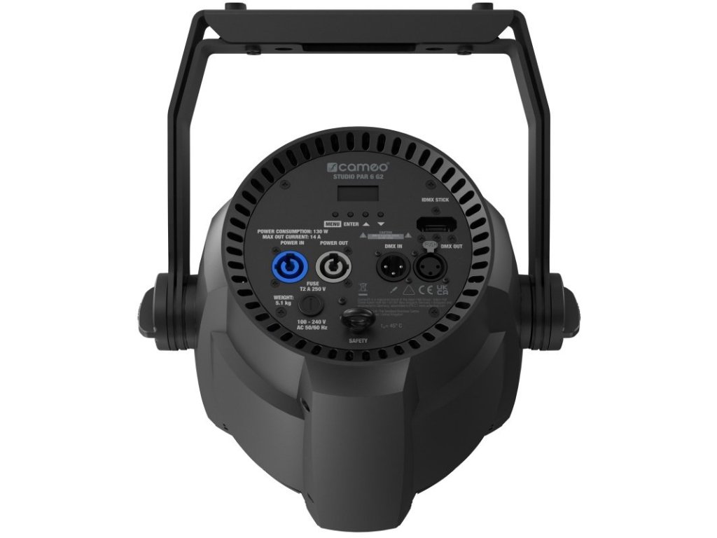 Dzięki regulowanej częstotliwości PWM w zakresie od 650 Hz do 25 kHz STUDIO PAR 6 G2 nadaje się również do pracy bez migotania w teatrze, studiu telewizyjnym, na ekranie filmowym lub na festiwalach. Zastosowanie jest jeszcze bardziej wszechstronne w połączeniu z opcjonalnie dostępnym Cameo iDMX Stick do bezprzewodowego sterowania STUDIO PAR 6 G2 przez W-DMX™.