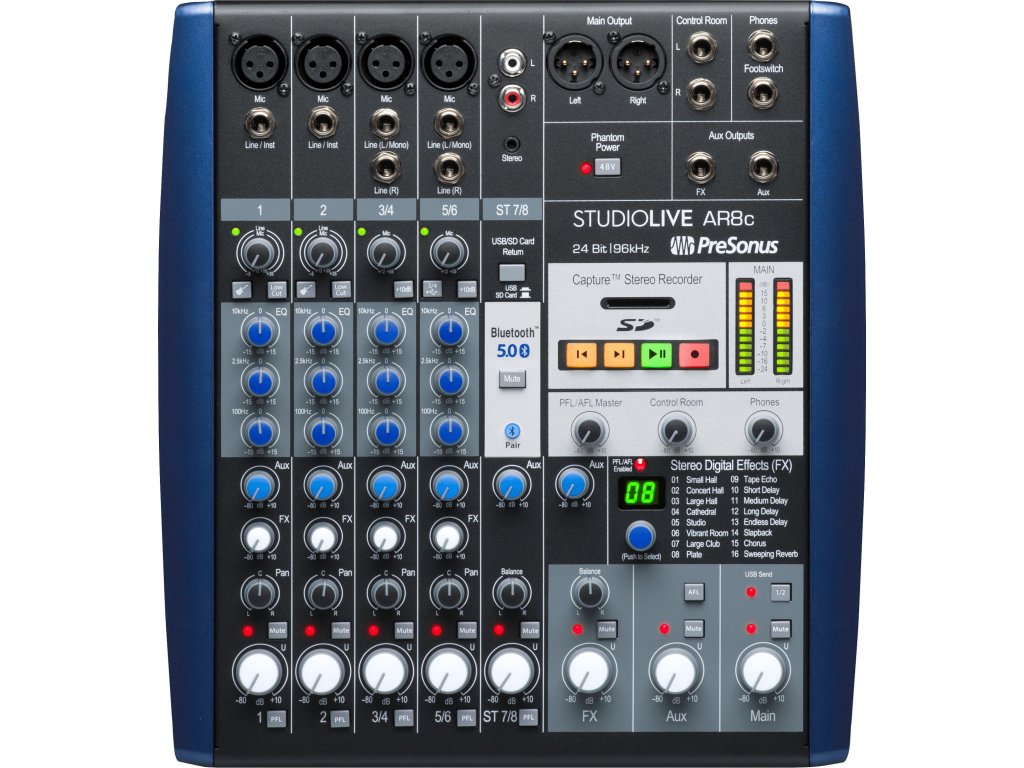 StudioLive AR8c o znanym designie analogowego miksera to najprostszy sposób na nagrywanie podcastów, transmisji na żywo i produkcji muzycznych. Hybrydowa konstrukcja modelu StudioLive AR8c z czterema przedwzmacniaczami mikrofonowymi XMAX o wysokim zysku i interfejsem audio 8x4, 24-bit / 96 kHz, kompatybilnym z USB-C USB 2.0 ułatwia miksowanie i nagrywanie. Dodaj instrumenty, takie jak muzyczny 3-pasmowy analogowy korektor, wzmacniacz mikrofonowy/liniowy dla źródeł wejściowych o niskim poziomie i zwykłych urządzeń, połączenie Bluetooth, stereofoniczny rejestrator SD i wejścia o wysokiej impedancji dla instrumentów, a otrzymasz urządzenie nadawcze i nagrywające, które spełnia potrzeby nowoczesnych muzyków i twórców treści.