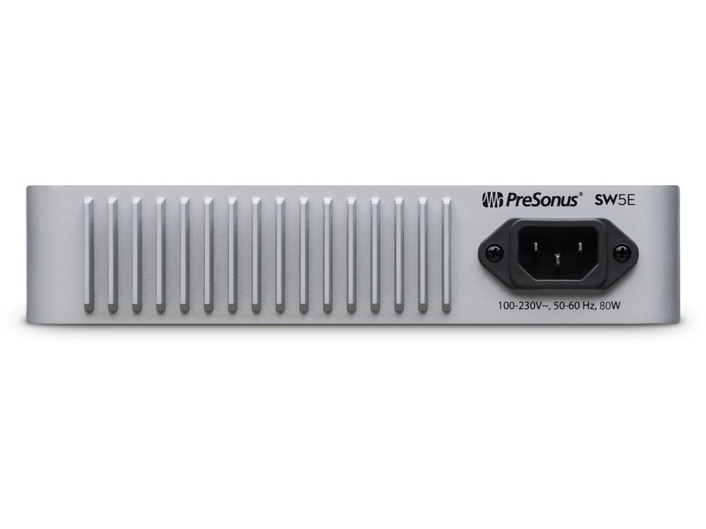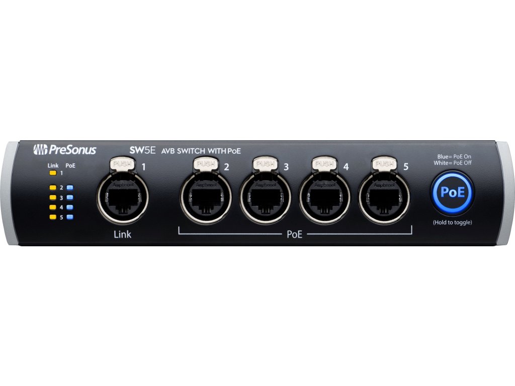 SW5E to pięcioportowy przełącznik AVB. Cztery porty mogą zasilać przez Ethernet (PoE) urządzenia kompatybilne z PoE, podczas gdy piąty port jest non-PoE, który można wykorzystać np. do połączenia z innym przełącznikiem. SW5E charakteryzuje się solidną, całkowicie metalową konstrukcją i może być montowany w szafie rack za pomocą uchwytów rack (brak w zestawie). Wszystkie porty wykorzystują bezpieczne, solidne złącza Ethercon, co czyni SW5E doskonałym wyborem do występów na żywo lub pracy w terenie.