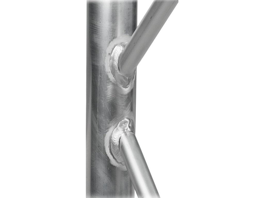 Kratownica DNA T3 100 składa się z dwóch rodzajów rur w układzie trójkątnym. Główne rury o średnicy 50 mm i grubości ścianki 2 mm stanowią podstawę konstrukcji, podczas gdy rury wzmacniające o średnicy 20 mm i grubości 2 mm uzupełniają całą kratownicę. Materiał konstrukcyjny z aluminium w kolorze srebrnym zapewnia estetyczny wygląd i wytrzymałość przy zachowaniu niskiej wagi.