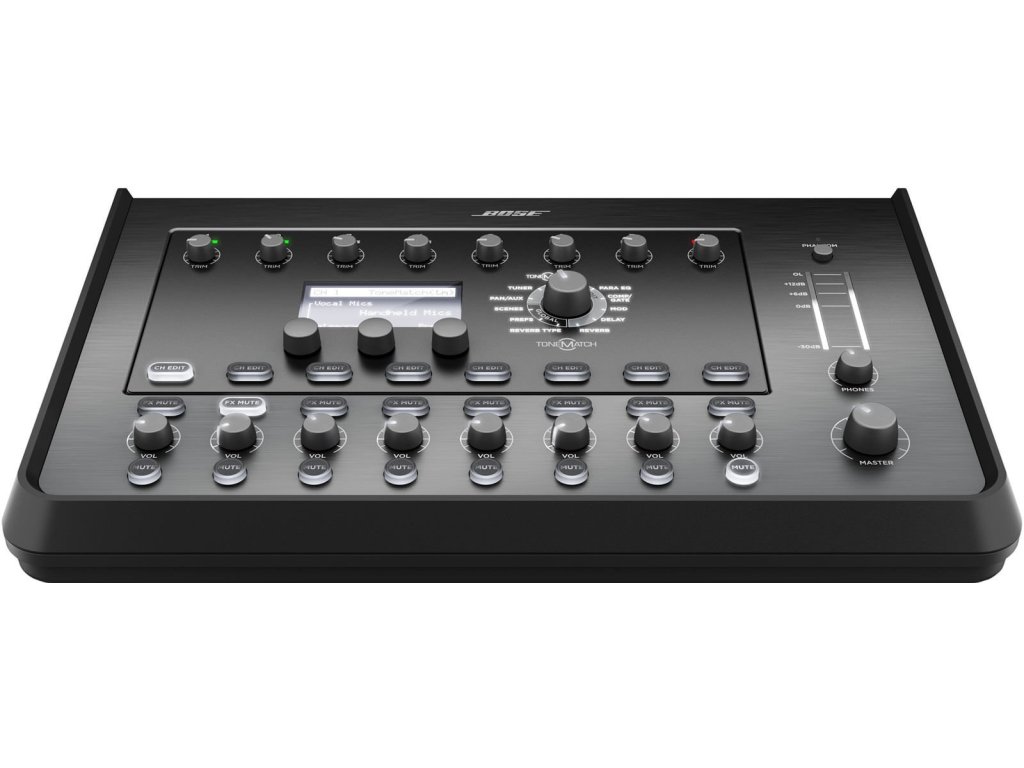 Opanuj swoją muzykę za pomocą konsoli mikserskiej T8S ToneMatch, kompaktowego, ośmiokanałowego interfejsu przeznaczonego dla artystów. T8S jest wyposażony w potężny silnik DSP i intuicyjne sterowanie, oferując korektor, dynamikę i efekty studyjnej jakości. Brzmi świetnie dzięki zintegrowanemu przetwarzaniu BoseToneMatch i zEQ, szczególnie po podłączeniu do systemu Bose L1 lub F1 w celu uzyskania pełnej, kompleksowej kontroli tonów. Dzięki solidnemu modelowi T8S możesz grać na scenie z pewnością siebie, korzystając z dotykowych elementów sterujących, czytelnego wyświetlacza LED i funkcji przywoływania scen. T8S, prawdziwy towarzysz artysty.