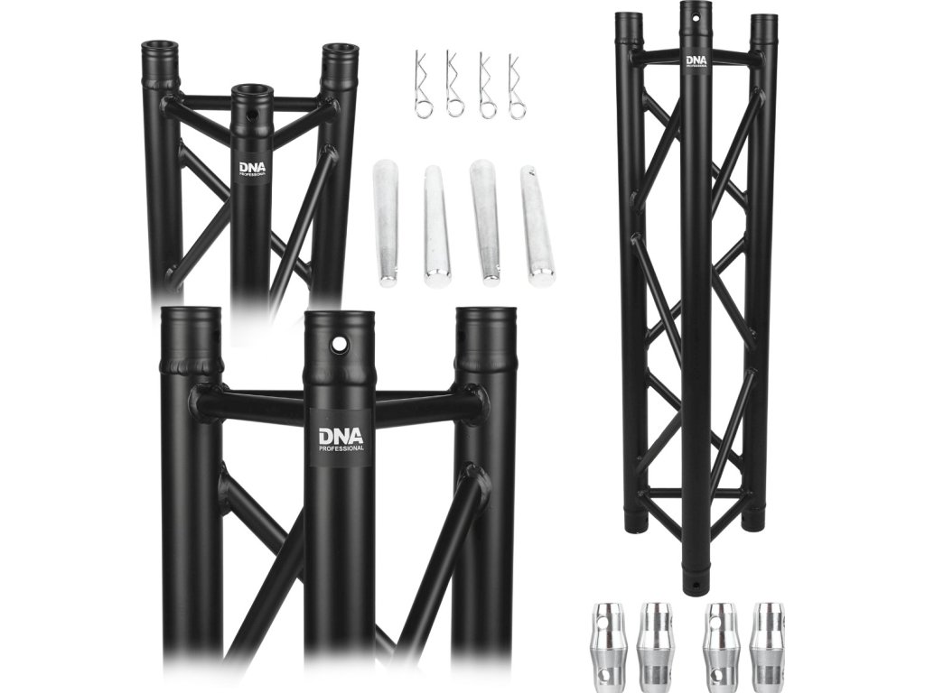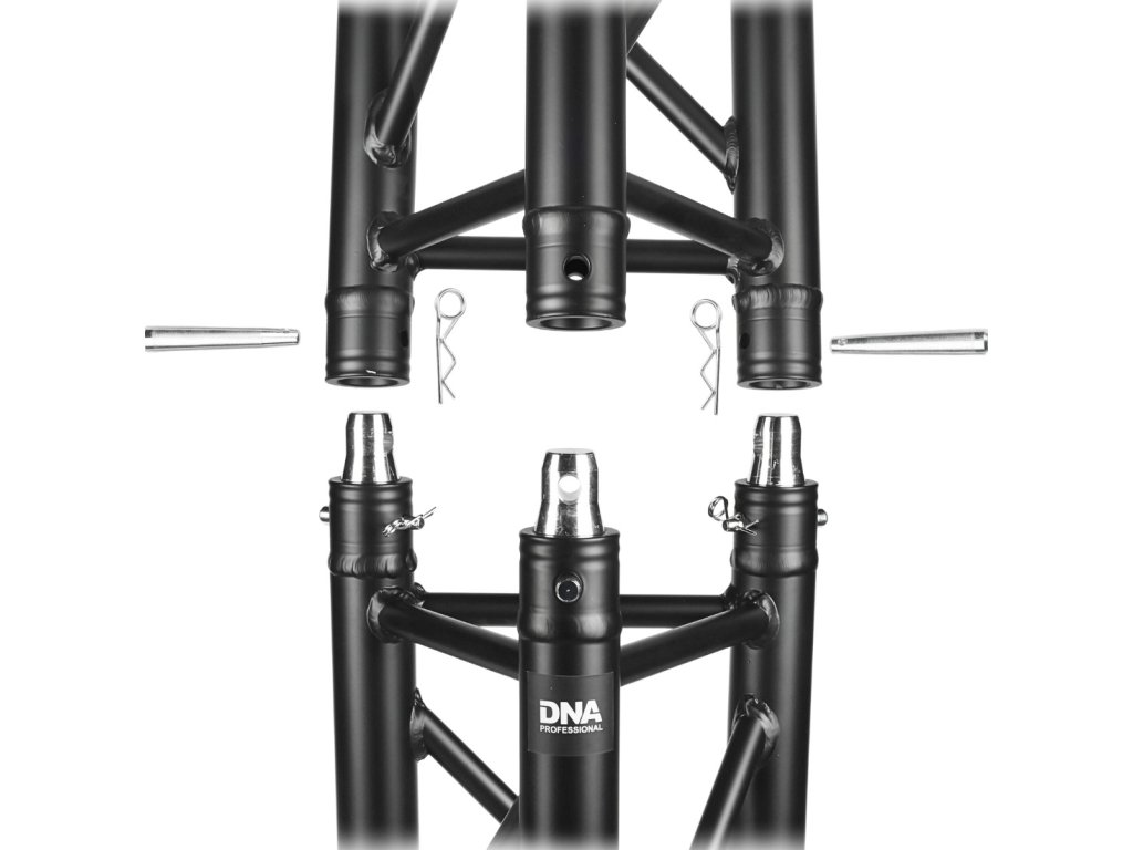 Kratownica DNA TB3 150 składa się z dwóch rodzajów rur w układzie trójkątnym. Główne rury o średnicy 50 mm i grubości 2 mm tworzą rdzeń nośny konstrukcji, podczas gdy wsporniki o średnicy 20 mm i grubości 2 mm uzupełniają całą kratę. Konstrukcyjny materiał aluminiowy w kolorze czarnym zapewnia estetykę i trwałość przy zachowaniu niskiej wagi.
