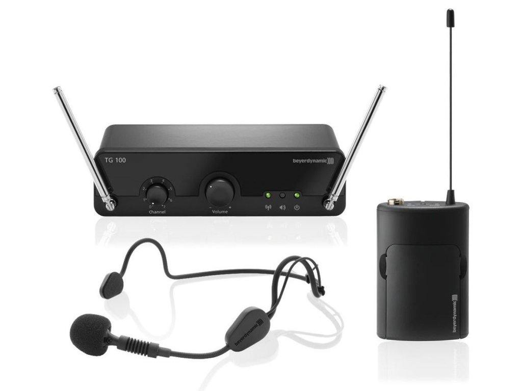 Zestaw bezprzewodowy VHF diversity składający się z nadajnika do paska TG 100 B, odbiornika TG 100 R i mikrofonu nagłownego TG H34c.