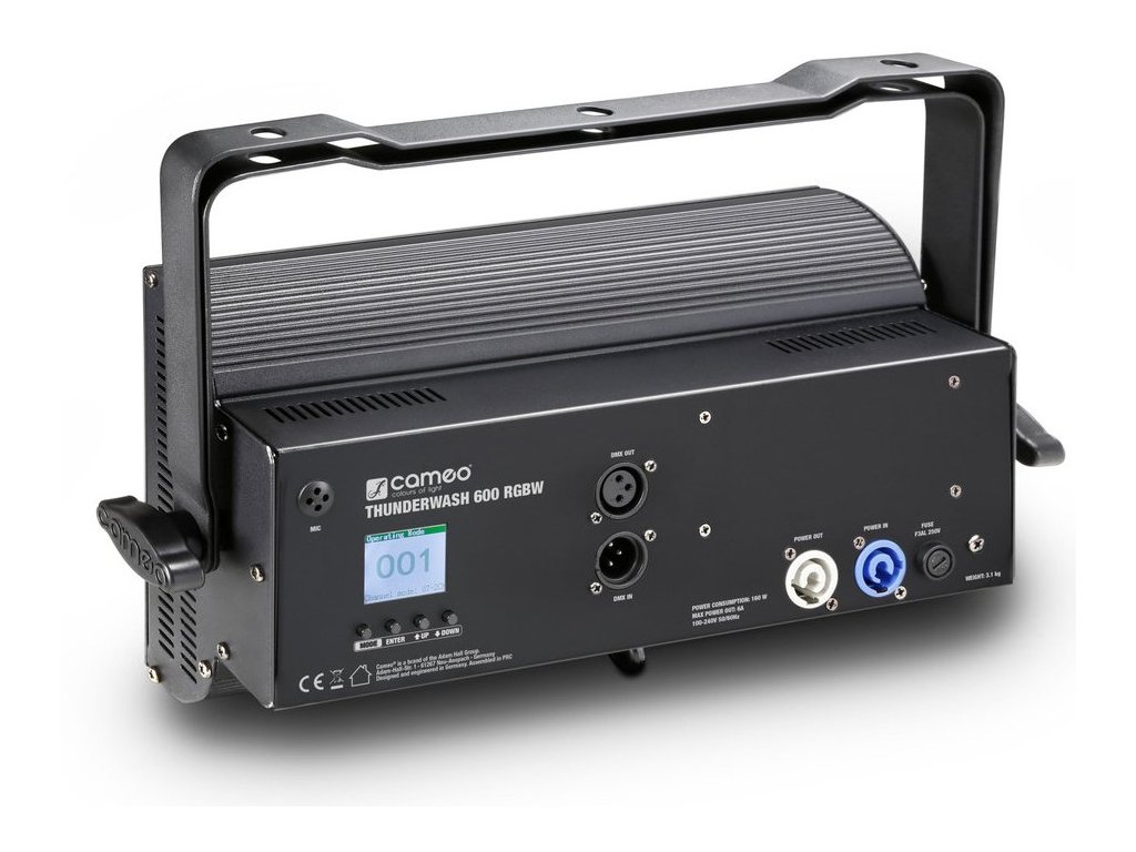 Nawigacja po menu i konfiguracja są dziecinnie proste dzięki kontrastowemu, kolorowemu wyświetlaczowi LCD z przyciskami trybu, wejścia, góra i dół. Thunder Wash 600 RGBW jest dostarczany w wytrzymałej, całkowicie metalowej obudowie z uniwersalnym wspornikiem montażowym. 3-pinowe złącza DMX i kompatybilne złącza powerCON umożliwiają łatwe łączenie łańcuchowe w celu zasilania pokazu kilkoma jednostkami.