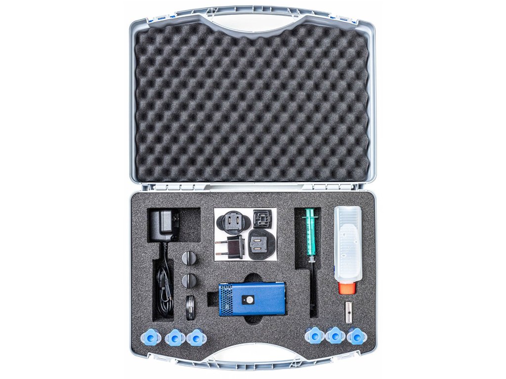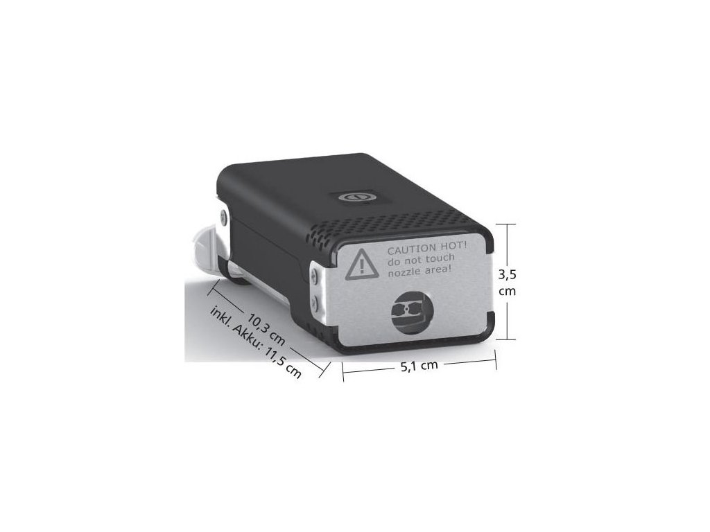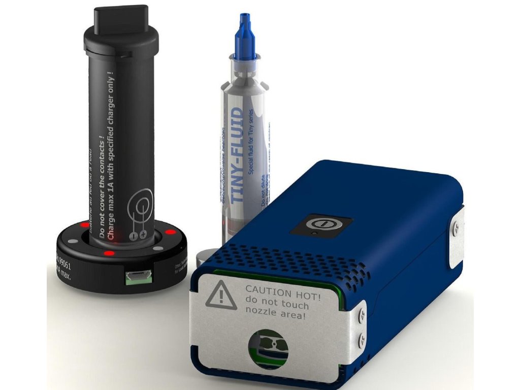 - Zawartość opakowania: 2 baterie (3,7 V), ładowarka i kabel, przewodowy pilot zdalnego sterowania, 6x zbiorniki na płyn 5 ml, zestaw do napełniania, 250 ml płynu Tiny-Fluid, futerał transportowy